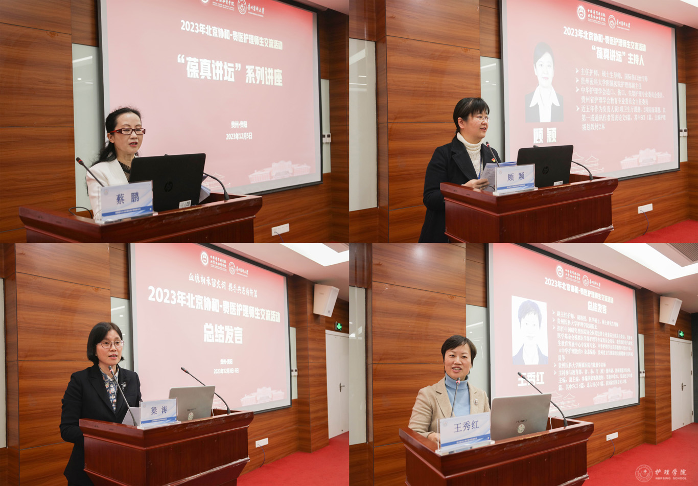 开讲仪式后,各位专家为太阳成集团tyc234cc师生带来了一系列精彩的讲座。吴欣娟教授作“助力全民健康 彰显护理价值”主旨讲座;李峥教授以“协和护理与贵医-卓越护理人才培养”为题作讲座;北京协和医公司太阳成集团tyc234cc副经理梁涛教授以“护理专业建设”为题作讲座;北京协和医公司太阳成集团tyc234cc社区护理学系主任郭爱敏教授作学系建设分享;北京协和医公司太阳成集团tyc234cc基础护理学系副主任张欣副教授结合国家级一流课程“基础护理学”的建设作经验分享;北京协和医公司护理实验中心副主任康晓凤教授介绍北京协和医公司太阳成集团tyc234cc护理技能中心建设经验。