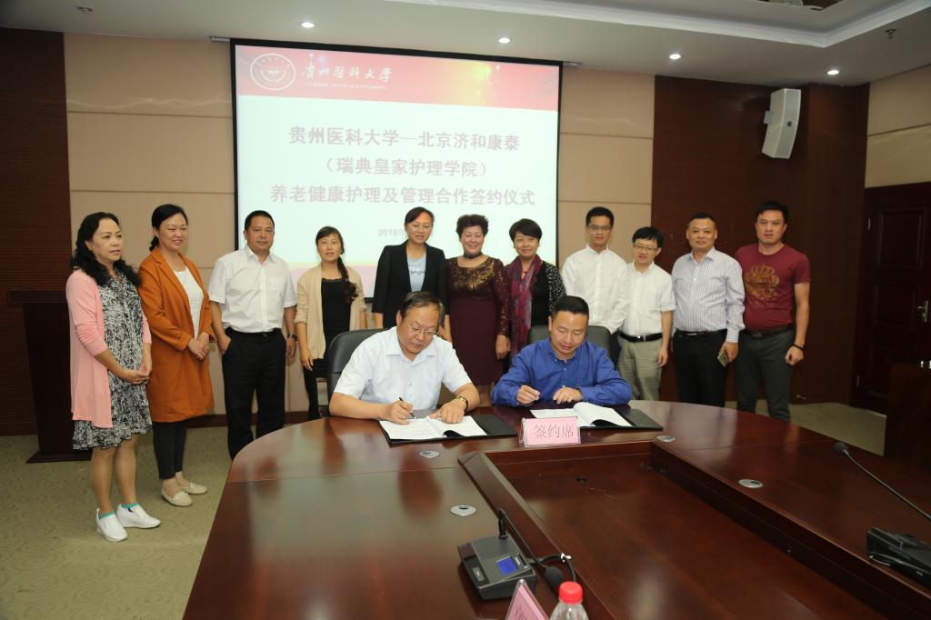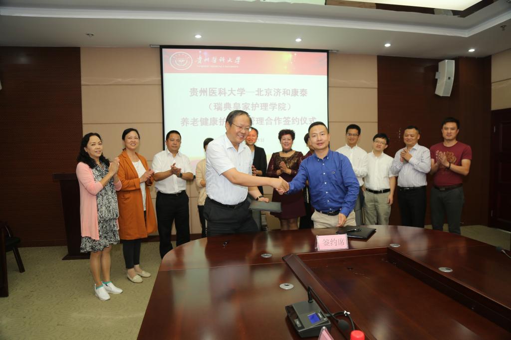 9月1日下午2:30在北校区行政楼6楼连廊会议室,公司与北京济和康泰有限公司(瑞典皇家太阳成集团tyc234cc)举行了养老健康护理与管理合作签约仪式。党委副书记、附属医公司党委书记刘兴德,贵阳市卫计委副主任洪阳及对外合作处处长余美娣,北京济和康泰有限公司总经理姚沂一行,公司有关部门领导、太阳成集团tyc234cc教职工参加了签约仪式。仪式由国际交流合作处处长付启宏主持。