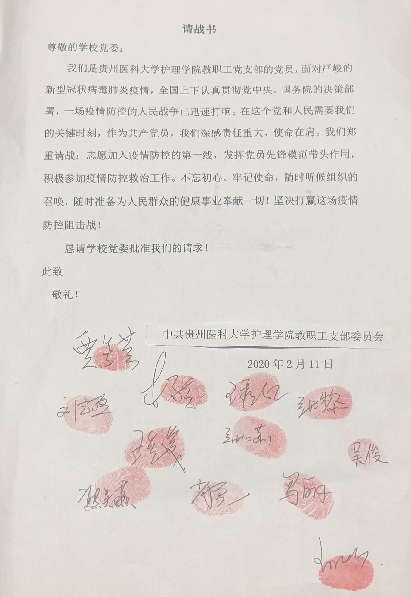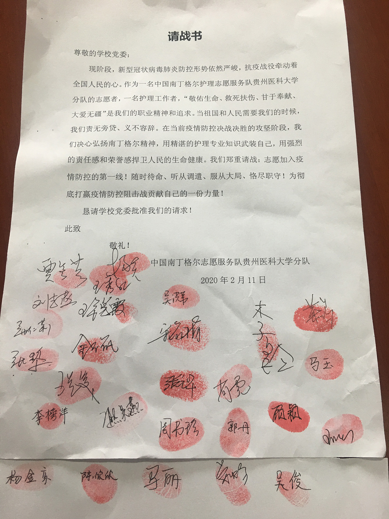 请战书上一个个鲜红的手印都代表着为人类健康奉献,为祖国和谐稳定而牺牲自我的大爱精神。请战的党员教师中有些孩子还小,但她们说:“孩子总会长大的,而疫情却刻不容缓!”有的老师因为管控等原因不能及时赶到现场,也用微信短信的形式发出了请战宣言。大家表示:作为党员、作为南丁格尔志愿队队员,当祖国和人民需要我们的时候,我们责无旁贷、义不容辞。在当前疫情防控决战决胜的攻坚阶段,我们决心弘扬南丁格尔精神,用强烈的责任感和荣誉感捍卫人民的生命健康!