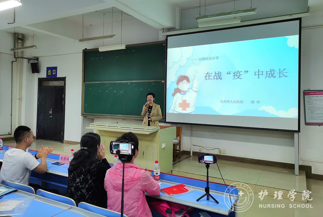 姚欢作了题为“在战疫中成长”的分享,她从抗疫出征、上岗前培训、抢救患者、护理患者的点点滴滴,向我们再现了援鄂医护工作者在鄂州的工作情况。黄秀峰讲述了给患者做治疗、进行护理操作的情节。最后他们分享了在抗疫期间的几点感悟:疫情是一面镜子,我们要分清真善恶;敬畏生命,敬畏自然;直面挫折,学会勇敢,用年轻的肩膀扛起时代赋予我们的使命。