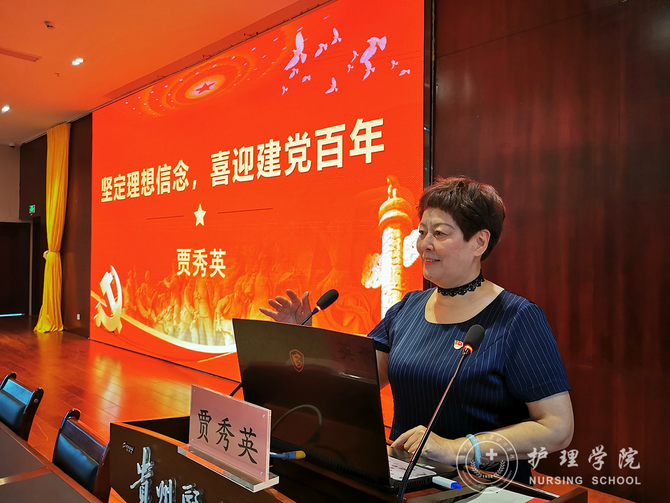 贾秀英用毛主席和习近平总书记在艰苦时期克服困难的事迹向全体师生讲述作为一名优秀的中国共产党员是如何用实际行动践行初心和使命。百年征程波澜壮阔,百年初心历久弥坚,中国共产党团结带领中国人民迎来中华民族从富起来到强起来的伟大飞跃,迎来实现中华民族伟大复兴的光明前景。2019年底新冠肺炎疫情爆发,党团结带领全国人民,用三个月时间取得湖北保卫战,疫情防控取得了显著成效,充分展示了中国精神、中国力量、中国速度。太阳成集团tyc234cc奔赴湖北抗疫一线的防疫医务人员也在用行动诠释着南丁格尔精神,冲在前列,迎难而上,彰显了党员本色。