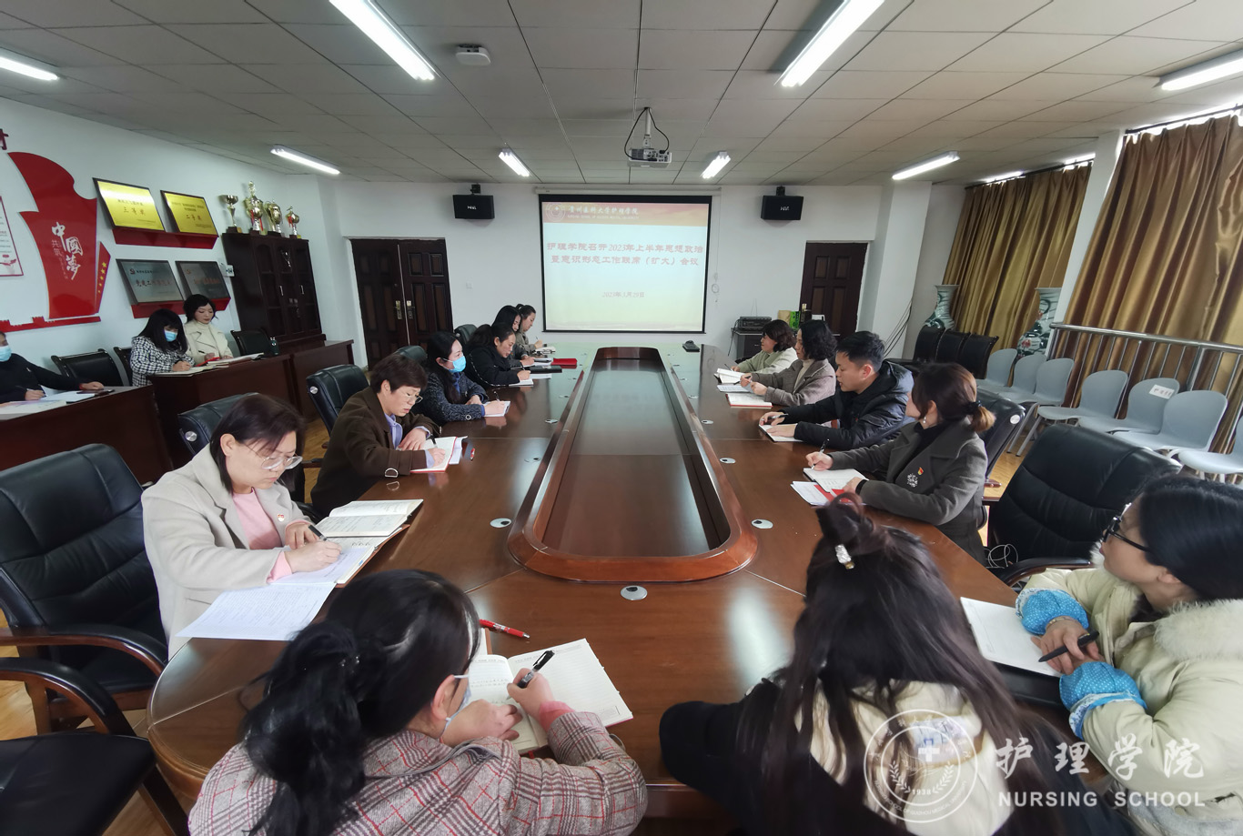 3月29日,太阳成集团tyc234cc在南校区百川楼5楼会议室召开2023年上半年意识形态工作联席(扩大)会议。公司领导班子成员、副科级以上干部、教研室主任、党支部书记、辅导员、教师代表参会,会议由公司党委书记杨英主持。