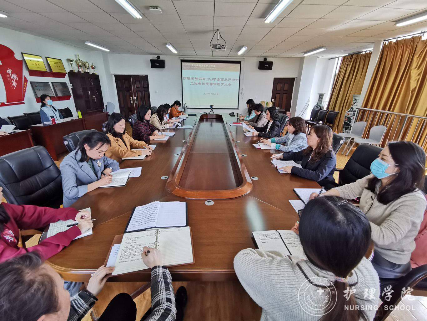 会上,杨英传达学习了二十届中央纪委二次全会精神、十三届省纪委二次全会精神、2023年全省教育系统全面从严治党工作会议精神。通报了公司开展师德师风自查自纠和专项整治工作要求,并对工作做了部署。期间,与会人员还学习了党风廉政警示案例,观看警示教育片《筑牢国家安全屏障——总体国家安全观贵在行动》,组织科级干部签订干部廉洁自律承诺书。