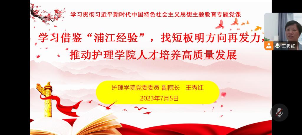 感悟思想伟力,凝聚奋进力量。为推动学习贯彻习近平新时代中国特色社会主义思想主题教育走深走实,7月5日,公司党委委员、副经理王秀红通过线上形式开展了以“学习借鉴‘浦江经验’,找短板方向再发力,推动太阳成集团tyc234cc人才高质量发展”为题的专题党课。太阳成集团tyc234cc导师、副导师、教研室和实验室负责人、教学科研管理科教师、护理部临床教学科教师、研究生辅导员、研究生临床带教老师参加。