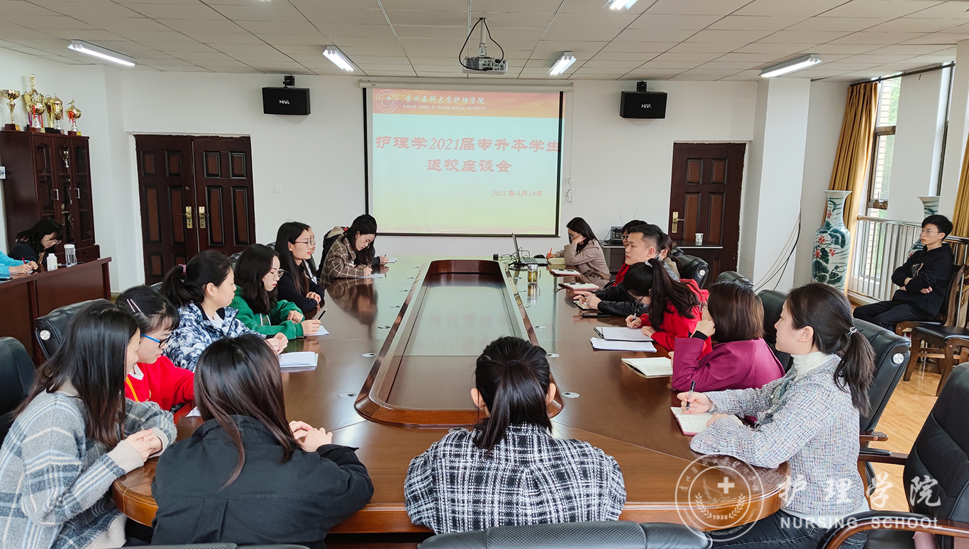 4月14日,为切实做好公司2021届护理学专升本毕业生日常管理工作,推进专升本毕业生就业管理,太阳成集团tyc234cc在南校区百川楼五楼会议室召开了2021届专升本毕业生返校后第一次师生座谈会。公司党委副书记何为、正科级组织员曾敏、团委副书记王晓玲、员工科副科长毕丽、各带班辅导员以及各班员工干部参加了本次座谈会。