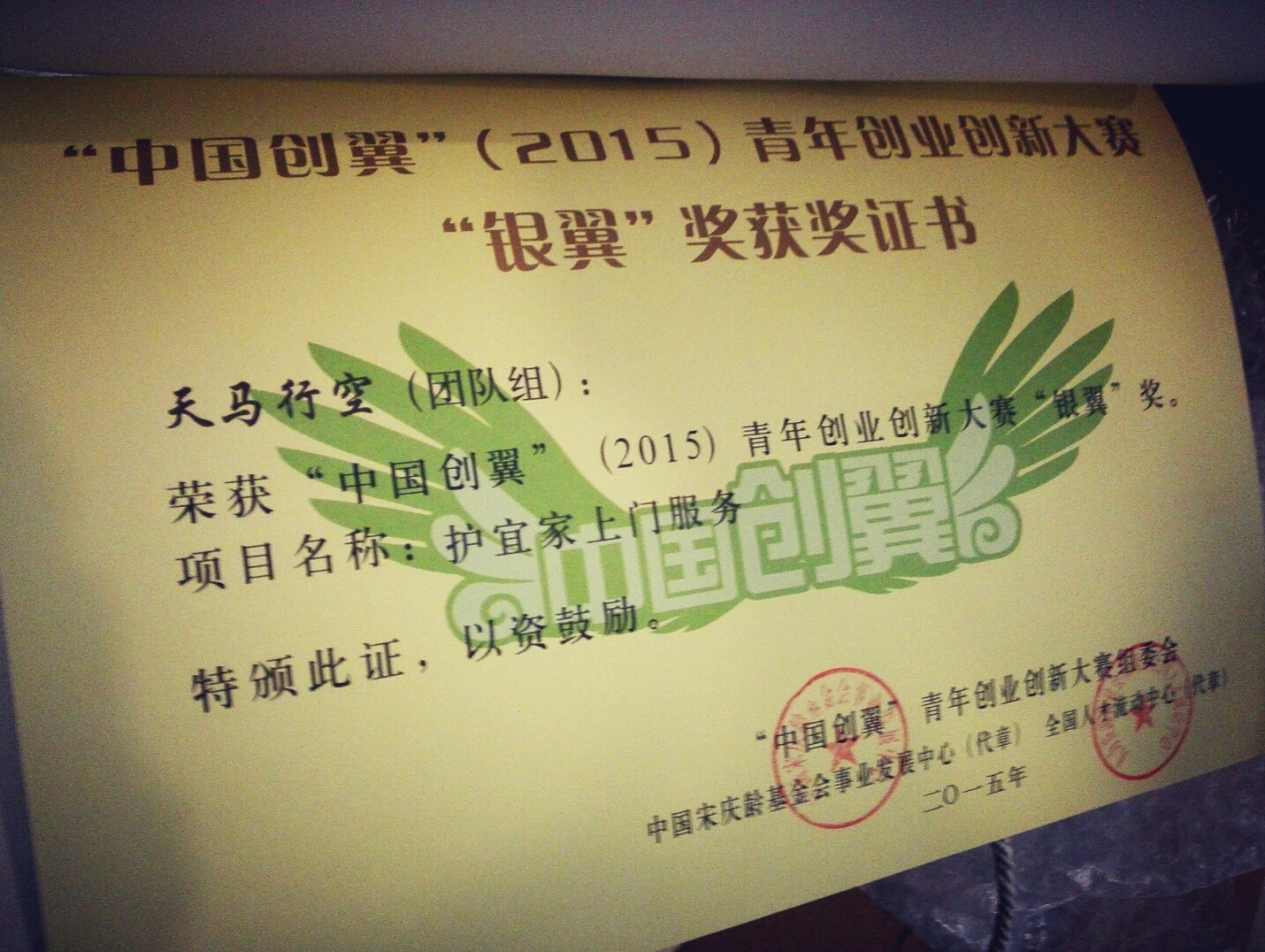 在相关领导的精心指导下,辅导员的悉心呵护下,参赛团队凭借扎实的基本功、过硬的专业素养、灵活机变的发挥、富有创意的产品设计,经过来自西南地区云贵川三省22支团队的激烈角逐,公司员工队伍的参赛项目《护宜家上门服务》荣获“中国创翼”(2015)青年创业创新大赛“银翼奖”。