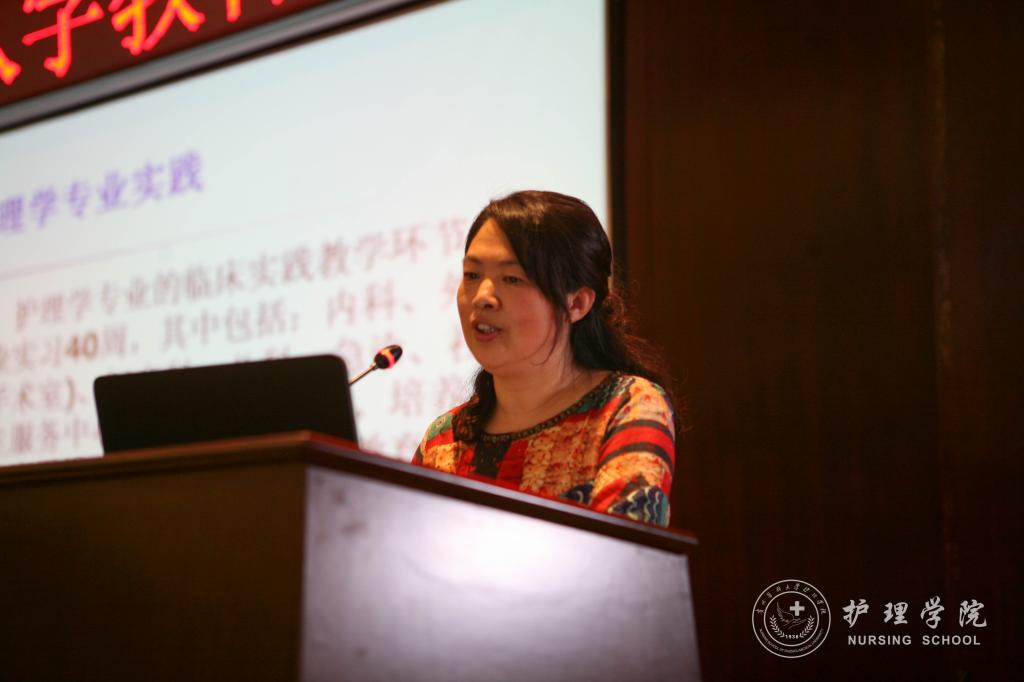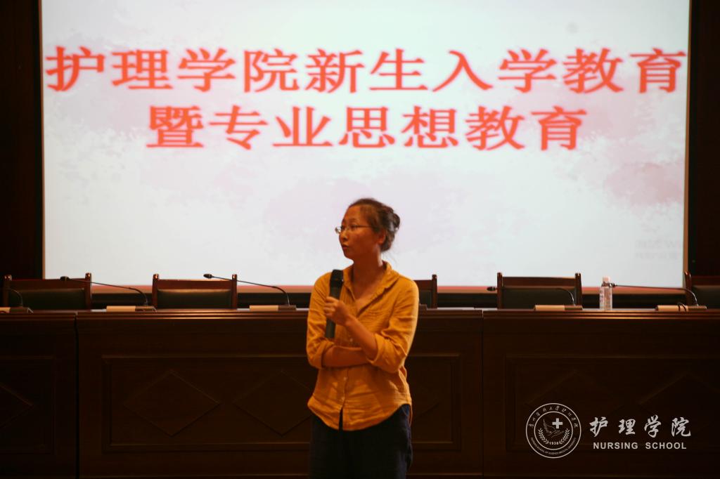 教师代表徐锟则从专业思想引领的角度分享了自己的护理学学习经历。徐锟老师结合自身实际、联系当今社会发展的现实,以老年人护理和孕妇护理为例分析了护理学的现实发展状况和长远发展前景,使新生有了更高的职业期待。