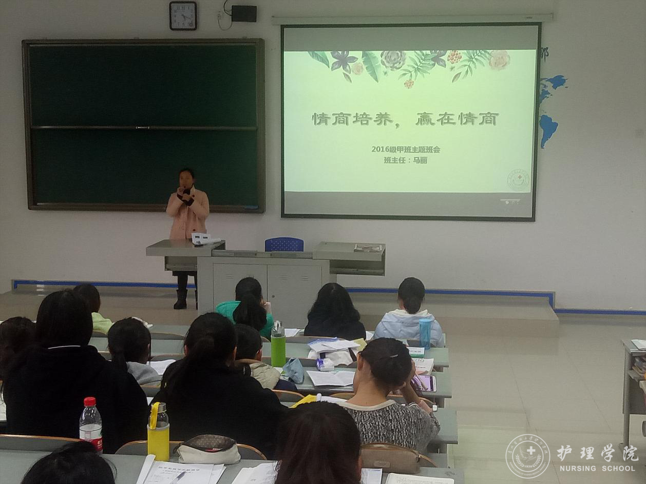 情商教育是造就全面发展护理人才的需要,是现代护理对护士素质的要求,也是确保护理工作质量的关键因素。为加强同学们对情商培养的重视,太阳成集团tyc234cc于11月29日下午在南校区4403教室开展 “情商培养 赢在情商”主题班会活动,班会由班长代敏同学主持,班主任马丽老师主讲,2016级护理甲班全体同学参加。