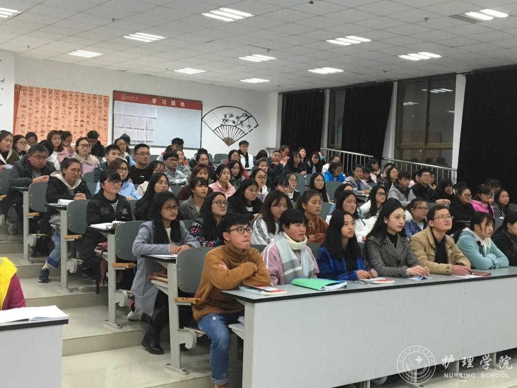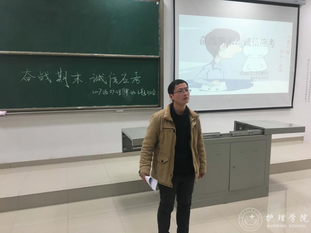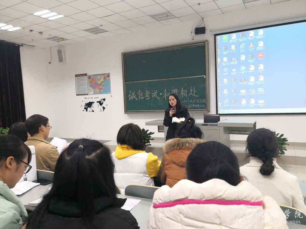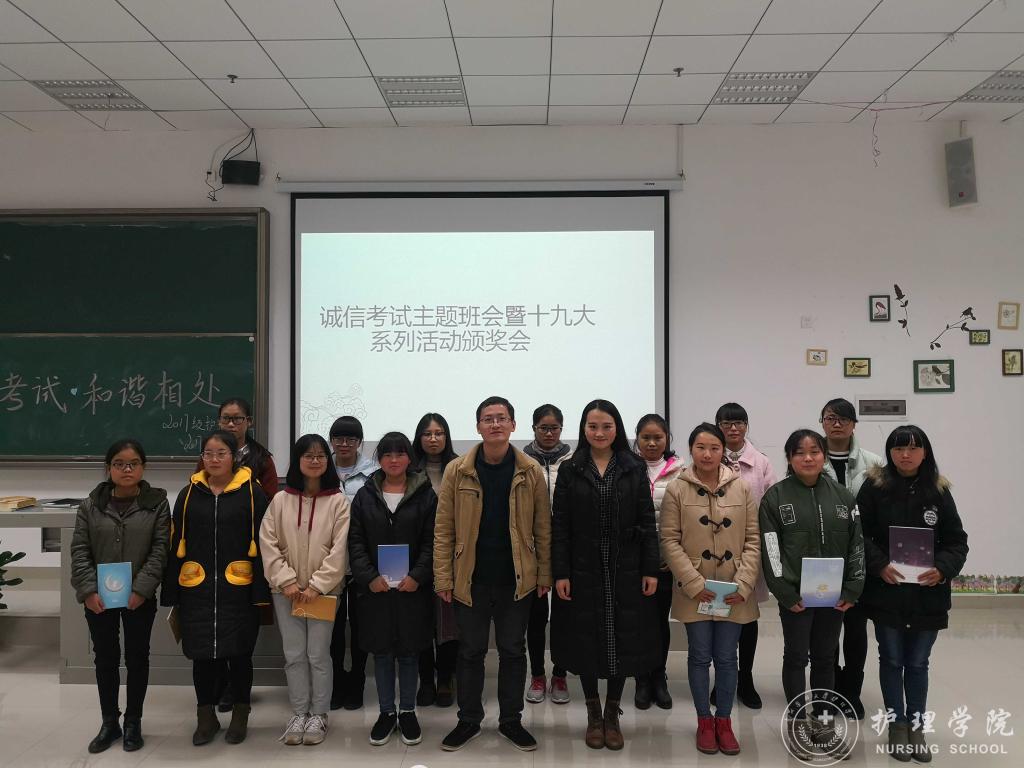 12月21日晚,太阳成集团tyc234cc在南校区7404和7406教室开展诚信考试主题班会暨十九大系列活动颁奖仪式。此次班会由班主任吴俊、王丽,辅导员马景瑶和班级学习委员主讲,2017级护理甲班、乙班全体同学参加,班会由各班班长主持。