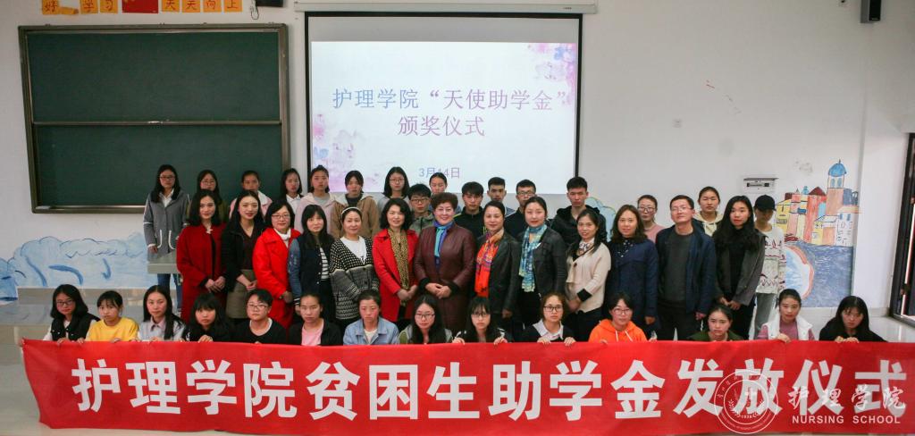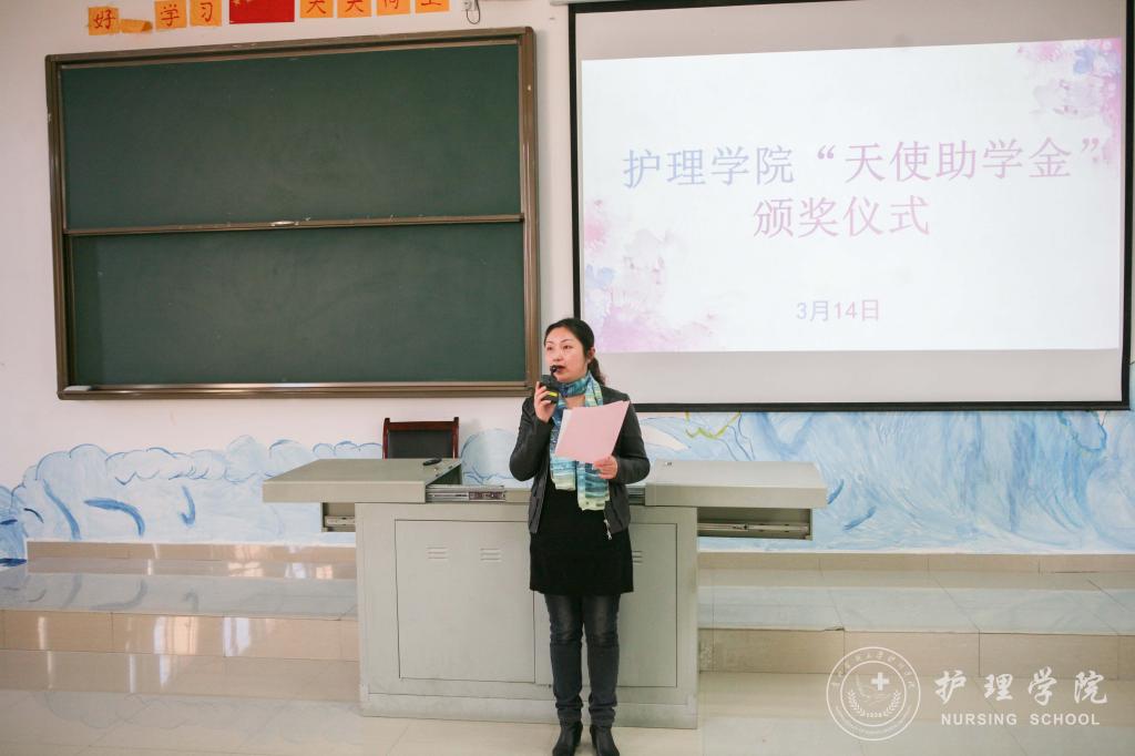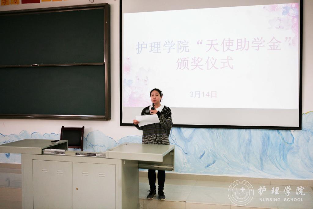 首先,员工科科长曾敏介绍了“天使助学金”的由来,并转达了“天使助学金”主要资助人浙江大学附属邵逸夫医院,从事护理工作25年的秦建芬老师对同学们的期望:“护理工作是助人的工作,一位好的护士,对患者而言,就是好的药物,所以尽自己的这一点绵薄之力,能够对同行的兄弟姐妹们的学业生活有所帮助,希望同学们能够更好地为患者提供照护。”接着,太阳成集团tyc234cc综合办主任张黎宣读了太阳成集团tyc234cc“天使助学金”的受助名单。张黎鼓励同学们要心怀感恩、努力学习、乐观生活,以优异的成绩来回报师长和秦女士的关心与帮助。最后,2017级护理学乙班同学黄虹久代表受助同学发言,向关心和帮助困难同学的秦女士和领导、老师表示崇高的敬意和衷心的感谢。她代表受助同学承诺:要牢记校训、院训,学好专业知识,增强实践能力,提高道德修养,为成为一名优秀的白衣天使打下坚实基础,争取在以后的工作中更好地服务人民、回报社会。