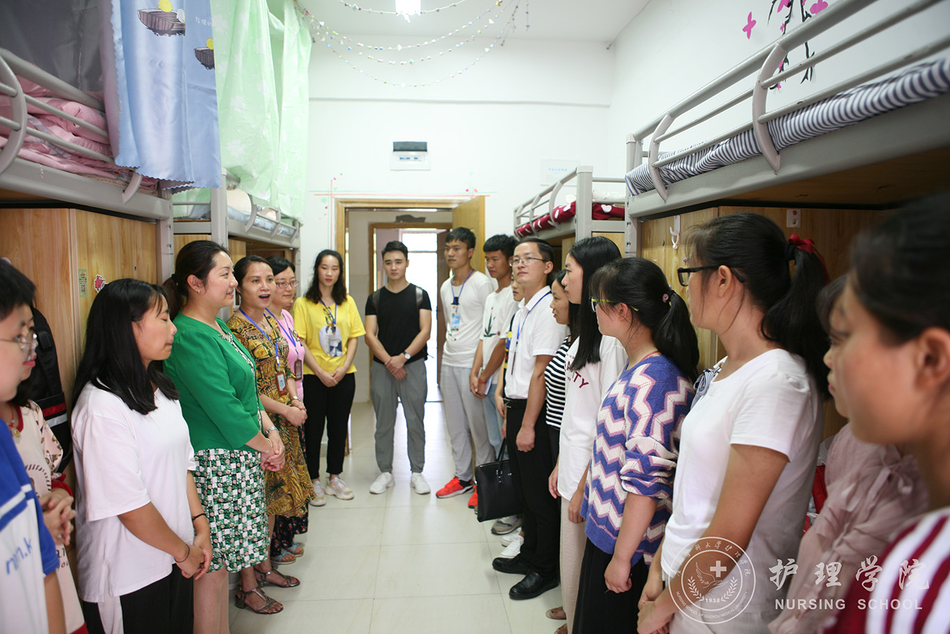 迎新工作接近尾声之际,杨英带领员工科科长曾敏、新生辅导员以及员工会干部前往新生宿舍看望2018级的同学们,杨英鼓励同学们要始终保持自信乐观心态,尽快适应大公司园生活,认真学习,热爱护理专业。