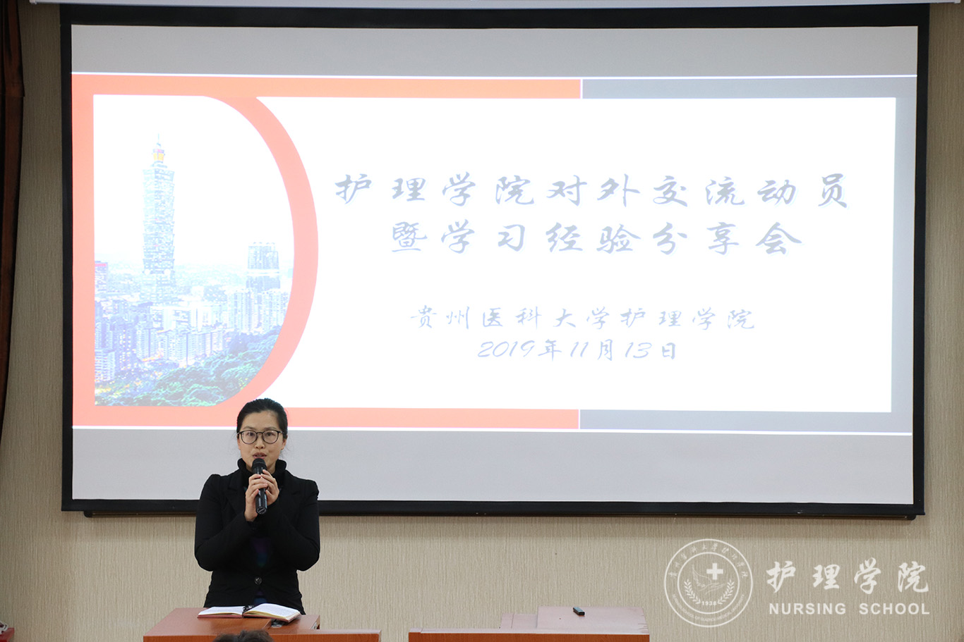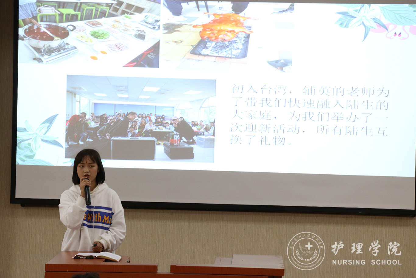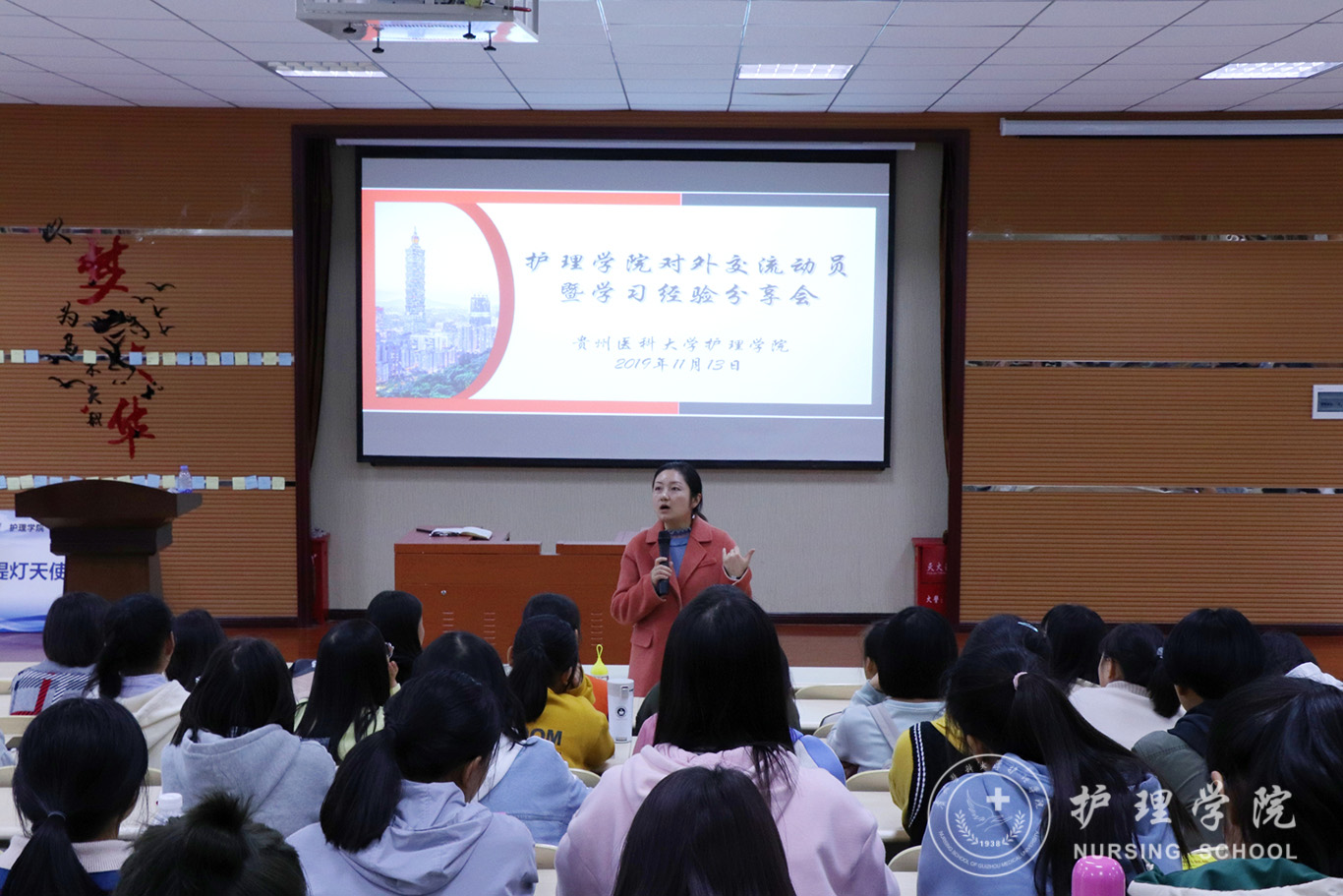 首先,毕丽解读了公司关于选拔员工赴境外交流学习的相关文件精神,对2020年春季对外交流学习项目进行了简要介绍。接下来,护理学2018级王文妮、助产学2018级焦婧两位同学分别就自己在台湾辅英科技大学一个学期的交流学习作了精彩分享。两位同学从入学前准备、课程学习、课外娱乐以及学习感悟等方面进行了详细介绍,落落大方的举止、生动自然的表达,潜心钻研学习的精神赢得了在场师生的赞誉。接下来,王秀红作对外交流动员讲话,她勉励同学们要珍惜机会,学会通过利用交换学习机会提升自己的综合能力;要树立国际视野,拓展见识,培养“走出去”意识;她嘱咐同学们:要读万卷书,也要行万里路。对外交流可以让我们及时找到差距,及时反思,促进学习由被动变为主动。青年学子要树立远大理想,不断更新观念,提升综合素质,为建设我们美丽富饶的祖国贡献更大的力量。