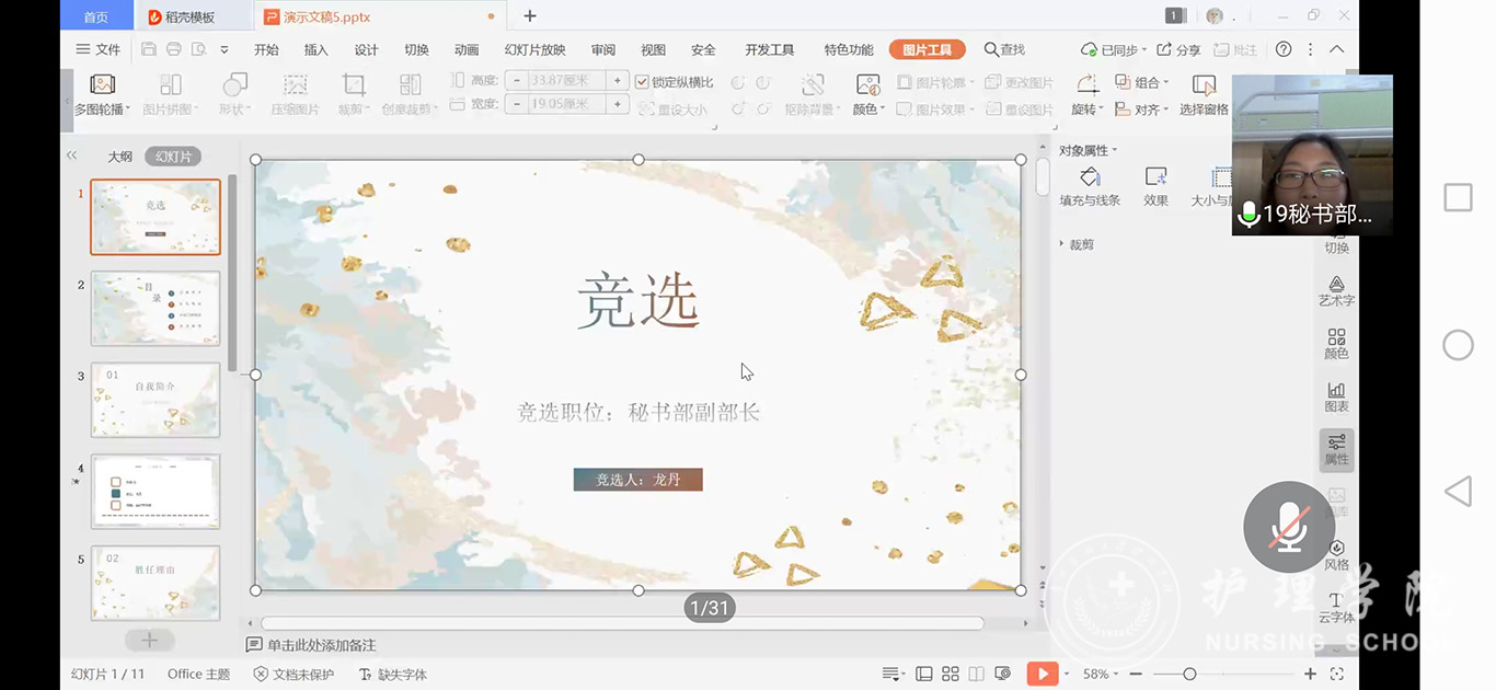 会议共分为三项内容。第一项为表彰大会,由王晓玲老师宣读获得优秀干部以及优秀成员的名单,优秀干部代表秘书部副部长杨庆庆同学和优秀部员代表策划部刘筱璇同学作为代表发言,表述了各自在协会活动中的收获,感谢老师和同学们的帮助,让自己在各方面都得到了很好的提升。会议第二项为换届选举,本着公平、公正、公开的原则,选取方式为问卷星进行线上投票。竞选会长、副会长、各部门部长、副部长的同学依次进行了演讲,每位同学都进行了精彩激烈的演讲的同时也充分展示了自己的优势。竞选演讲结束之后,协会会长申思蓉同学进行了协会工作总结发言,寄托新成员们新的希望,祝福协会能在新一届协会干事们的带领下越办越好。最后,王晓玲老师对本次大会进行了总结,她讲到学联员工会改革的必要性,并对员工会礼仪部的加入表示欢迎,同时对协会的工作作出了肯定,对新一届协会干事们提出了要求,鼓励同学们团结进取,学好扎实基本功,做好各方面的领头羊,不断提升护理专业员工的自我认同,铭记南丁格尔誓言,为人类健康和生命而不懈奋斗,希望协会一路乘风破浪,愈来愈好。