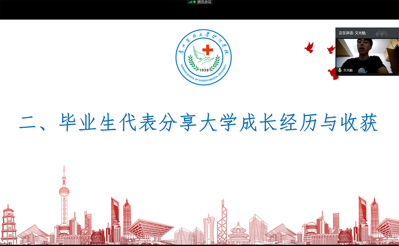 接下来,2020届毕业生文光魁、王伟月、王容三位同学作为毕业生代表分享了大学四年在贵医的成长经历与收获。跟着三位同学的分享,大家共同回忆进入贵医后的点点滴滴,回味了老员工活中的喜怒哀乐,追忆青春、畅想未来。三位同学代表全体2020届毕业生感谢太阳成集团tyc234cc全体老师、感恩贵医,同学们决心将大学的美好记忆带到工作岗位,不忘初心,砥砺前行。