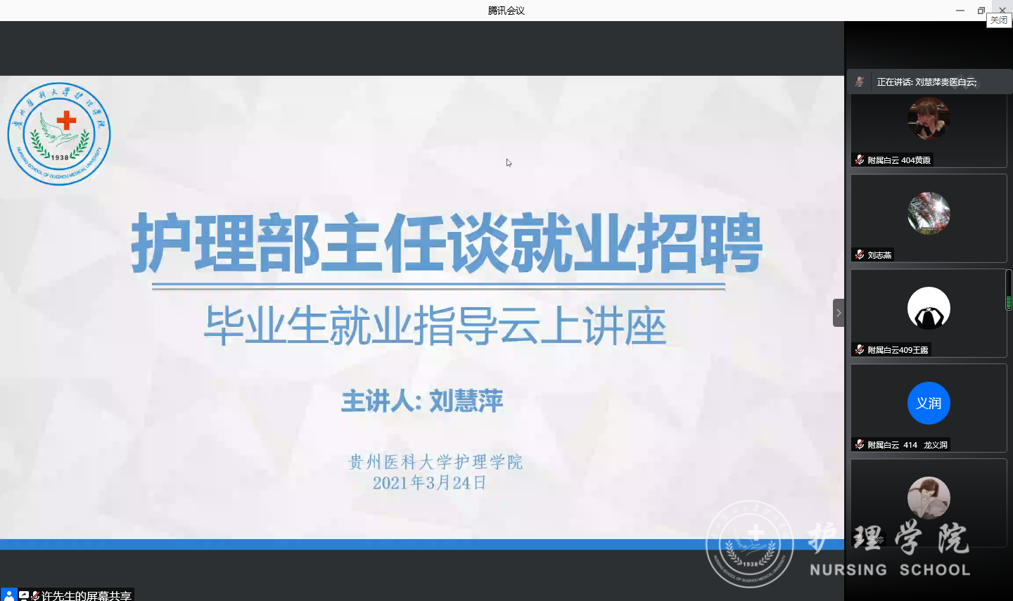 3月24日,为做好2021届毕业生就业工作,提高公司毕业生就业招聘面试通过率,公司特邀太阳成集团tyc234cc附属白云医院副经理、护理部主任刘慧萍为大家进行了一场毕业生就业指导云上讲座。公司党委副书记何为、党委委员、副经理刘志燕出席了会议,校本部及四个教学点辅导员、全体同学毕业生参加了此次会议。