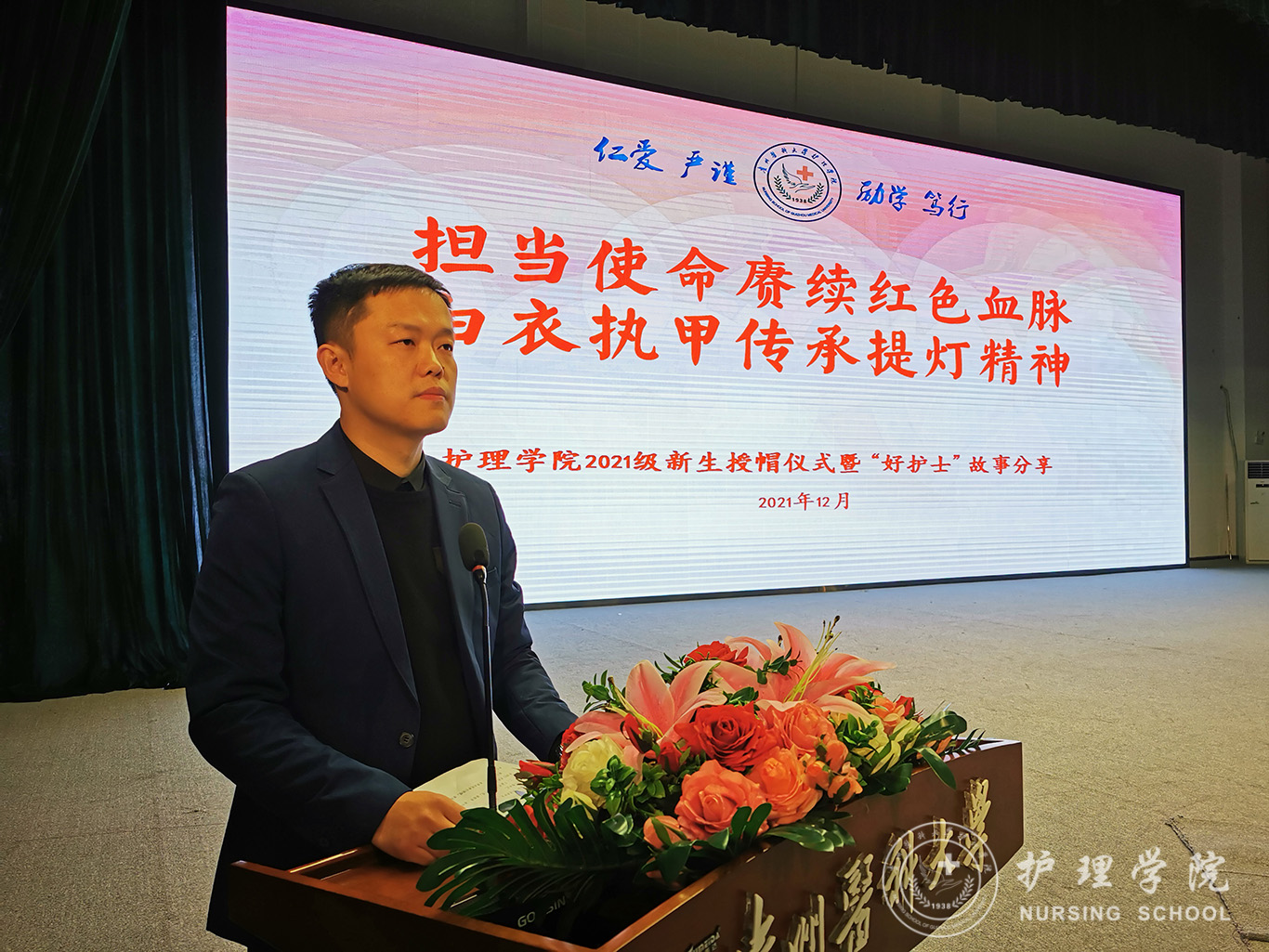12月8日,为纪念“一二·九”运动86周年,传承和弘扬护理事业的光荣传统,激励新生增强使命感、责任感和归属感,在新时代新征程中勤奋学习,奋勇争先,太阳成集团tyc234cc在南校区大礼堂举行了以“担当使命赓续红色血脉、白衣执甲传承提灯精神”为主题的2021级新生授帽仪式暨“好护士”故事分享活动,由28位优秀护理前辈为724名护理新生授帽传烛。活动由公司党委副书记兼纪委书记何为主持。