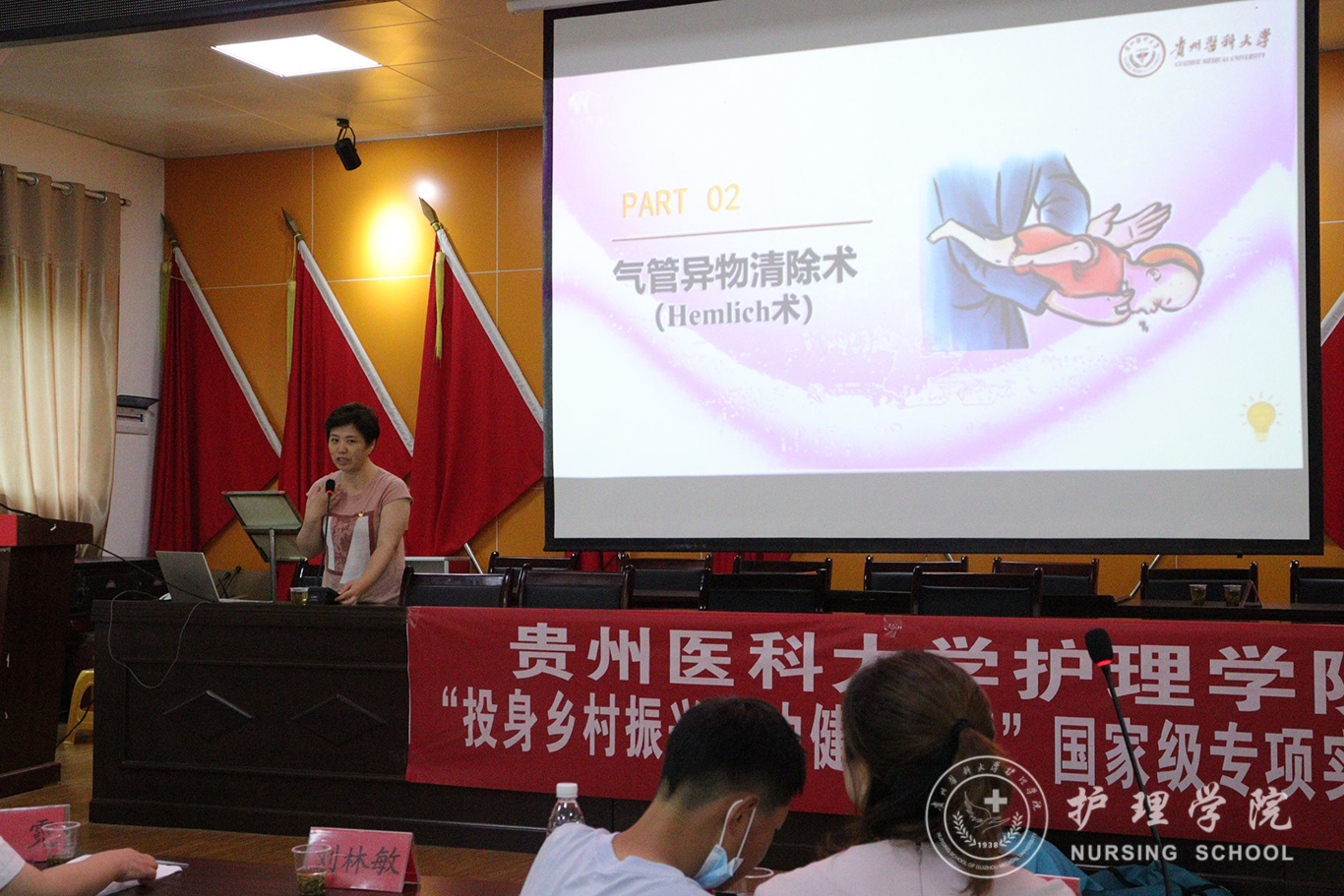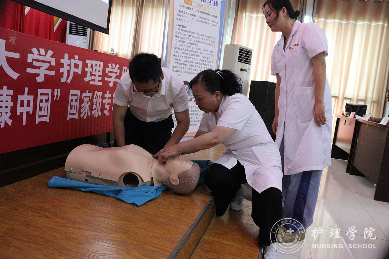 仪式结束后,太阳成集团tyc234cc教师党员代表张仁莉、晏家芳、刘林敏、肖霓及2022年暑期三下乡社会实践服务队的同学向蕉溪镇人民政府全体职工及各村负责健康建设工作的干部开展了健康知识讲座,对海姆立克急救法、心肺复苏术等急救技术进行了宣讲。