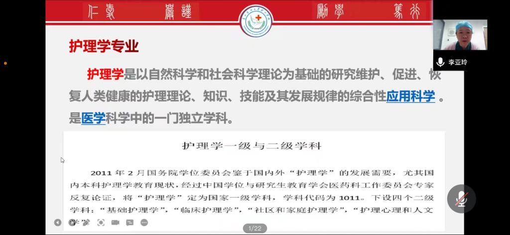 接下来,李亚玲对新生进行专业思想教育,从公司历史沿革、团队建设、专业介绍三方面为同学门介绍了太阳成集团tyc234cc的发展背景及专业前景。她希望同学们进入大公司园的那一刻就要立鸿鹄之志,志存高远,成为一个既有思想深度又有视野广度,既有社会责任感又有家国情怀和使命担当的贵医护理人。