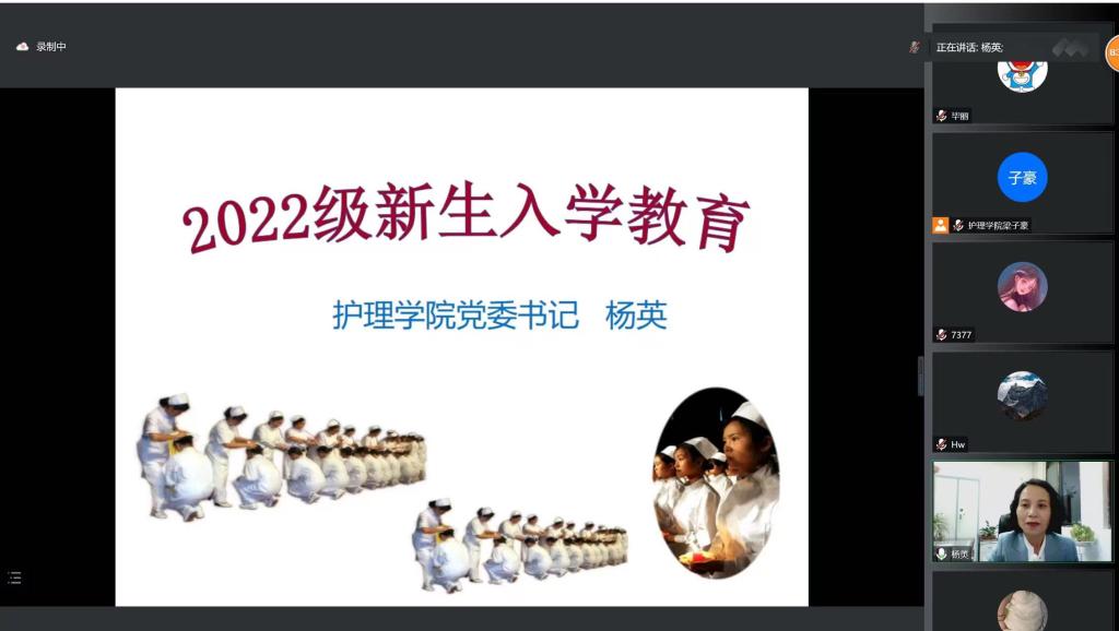 活动分为四个议程,首先杨英对全体新生进行入学教育,她分别从现代护理学的诞生、护理学的发展、人生规划与专业发展等四个方面为同学们进行了讲授。她希望同学们尽快确立人生的远大理想和大学的奋斗目标,珍惜大学时光,将个人的理想追求融入党和国家事业之中,努力使自己成为国家建设的有用之才、栋梁之才。