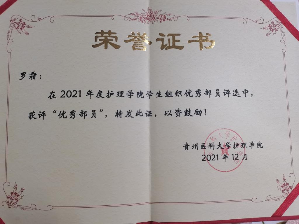 罗霜,女,汉族,中共预备党员,助产学2020级员工,现任护理技能协会技训部部长、班级疼痛护理学课代表,围生期保健学、急危重症护理学组长。大学期间,她学习认真踏实,成绩良好。在思想上,她积极向党组织靠拢,及时汇报自己的思想,已经成为一名光荣的中共预备党员。作为技训部部长,曾多次组织各班员工代表参与护理技能操作培训,积极参与各类校园文化活动和社会志愿服务,随时准备为社会贡献自己的一份绵薄之力。