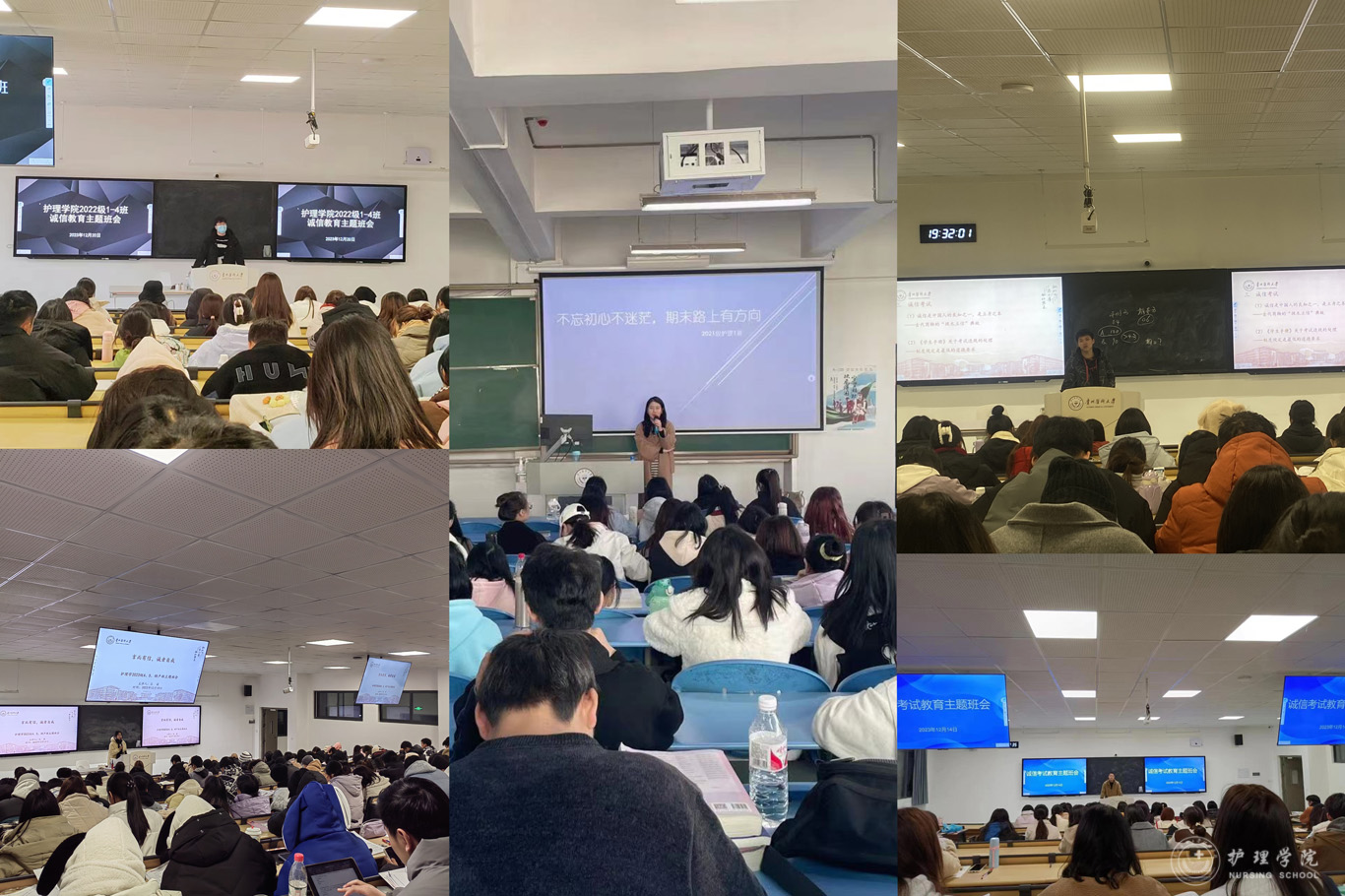 2021-2023级分别以“不忘初心不迷茫 期末路上有方向”“学向勤中得 踏实则有为”“言而有信 诚者自成”等为主题进行诚信教育。会上,辅导员老师们对比了大学考试与高中考试的变化,鼓励了同学们正视变化,认真努力的备考,沉重冷静地应考。部分班级邀请学习委员分享学习方法、带领同学们学习《员工手册》中关于考试作弊等违纪行为的处理条款,强调了诚信的重要性,呼吁同学们要做到诚信考试、诚信立人。