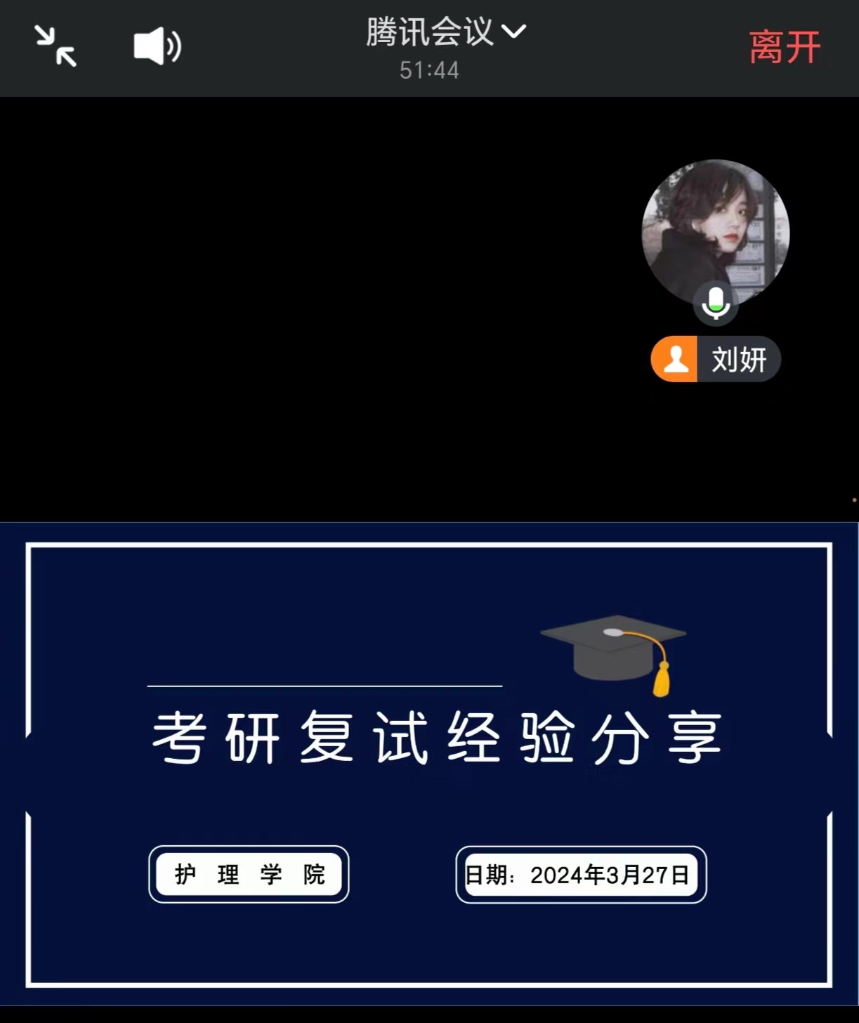 首先,刘妍介绍了今年公司毕业生考研的整体状况,对参会进行交流的在读研究生进行了简要的介绍。接下来,遵义医科大学在读研究生陈悦、李珊和刘凌扬依次交流发言,她们从遵医研究生复试的程序、注意事项以及技能操作等方面作了详细讲解和分享。太阳成集团tyc234cc在读研究生李江燕则重点从复试礼仪、语言表达、答题技巧等方面对贵医考研复试进行了全面的讲解。毕业班辅导员毕丽鼓励进入研究生复试的同学要树立信心,戒骄戒躁,以最佳的精神面貌迎接复试,坚持不断学习以提升自身的综合素质。