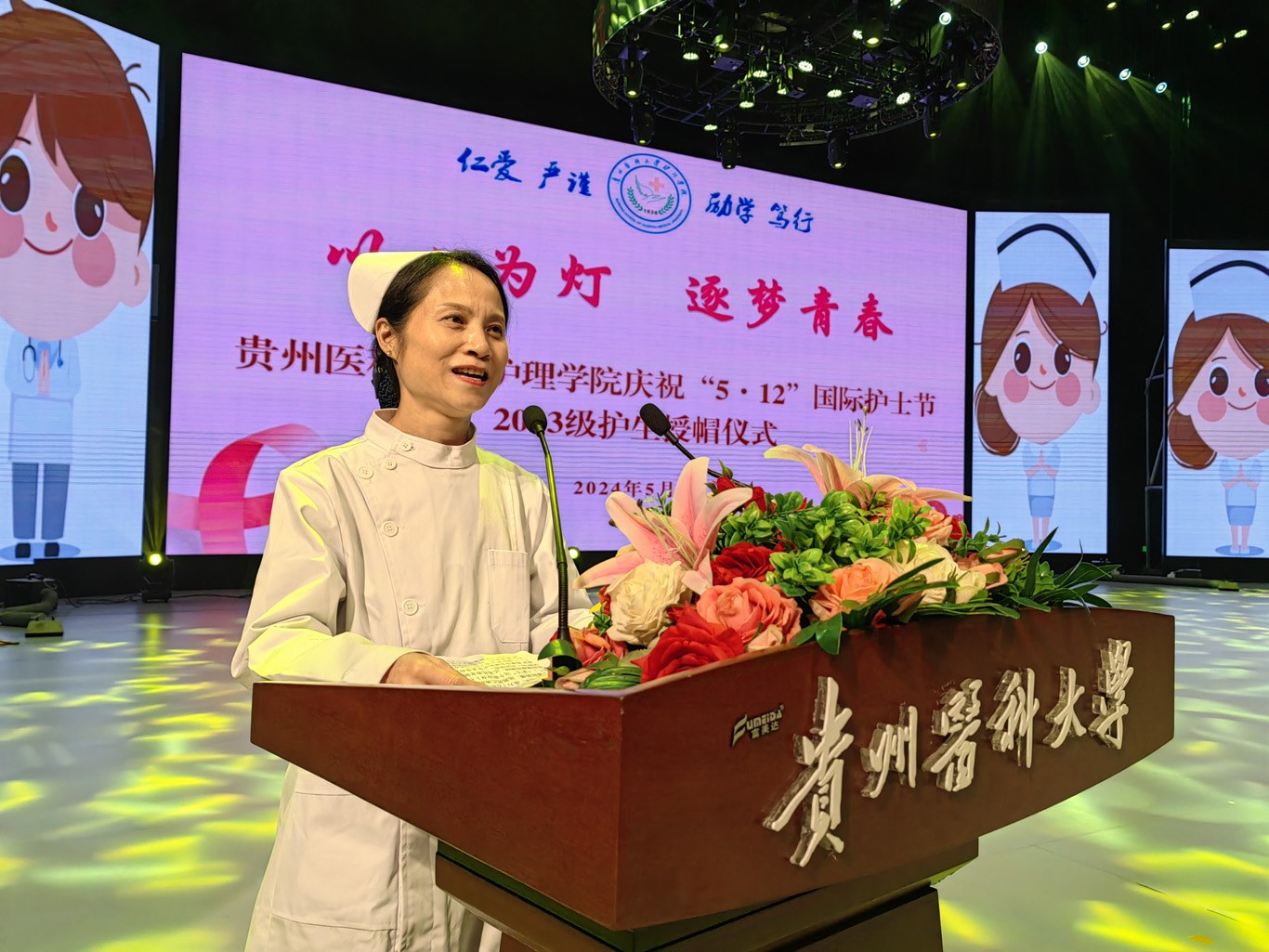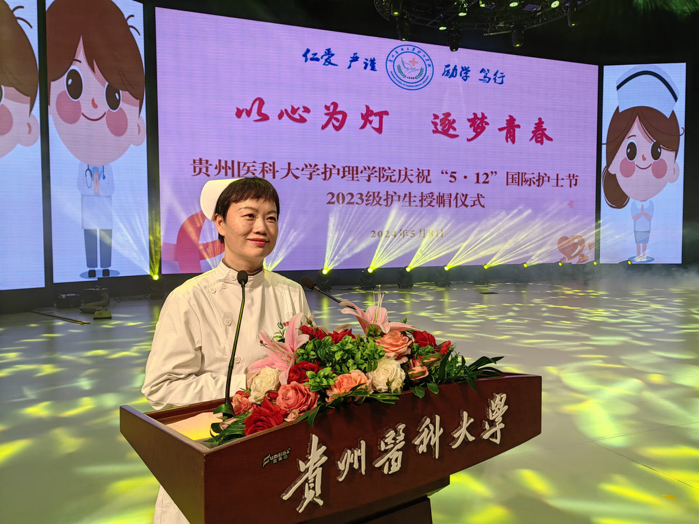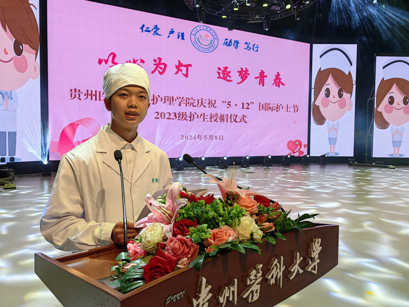随着悠扬的音乐响起,年轻学子们身着白衣,手捧燕帽,有序入场,28名前辈亲手为他们戴上了圣洁的燕帽,这庄严而又神圣的时刻象征着贵医护理人的代代传承。在经理李亚玲的带领下,同学们纷纷举起右手,许下了“燃烧自己,照亮别人,把毕生精力奉献给护理事业。”的庄重誓言,齐唱《中国护士之歌》。