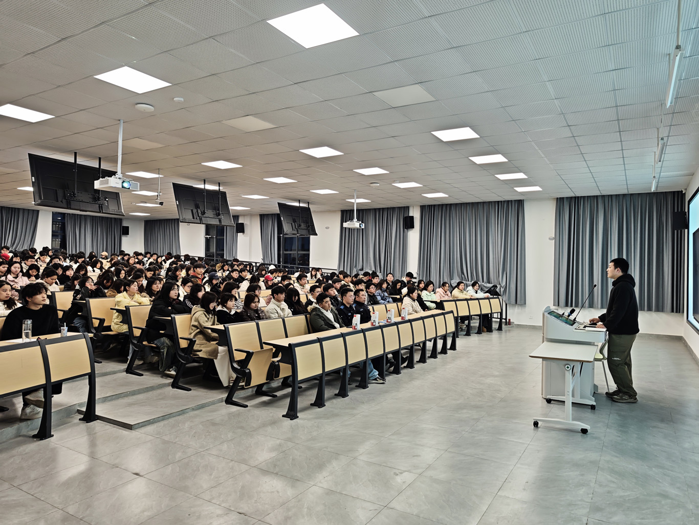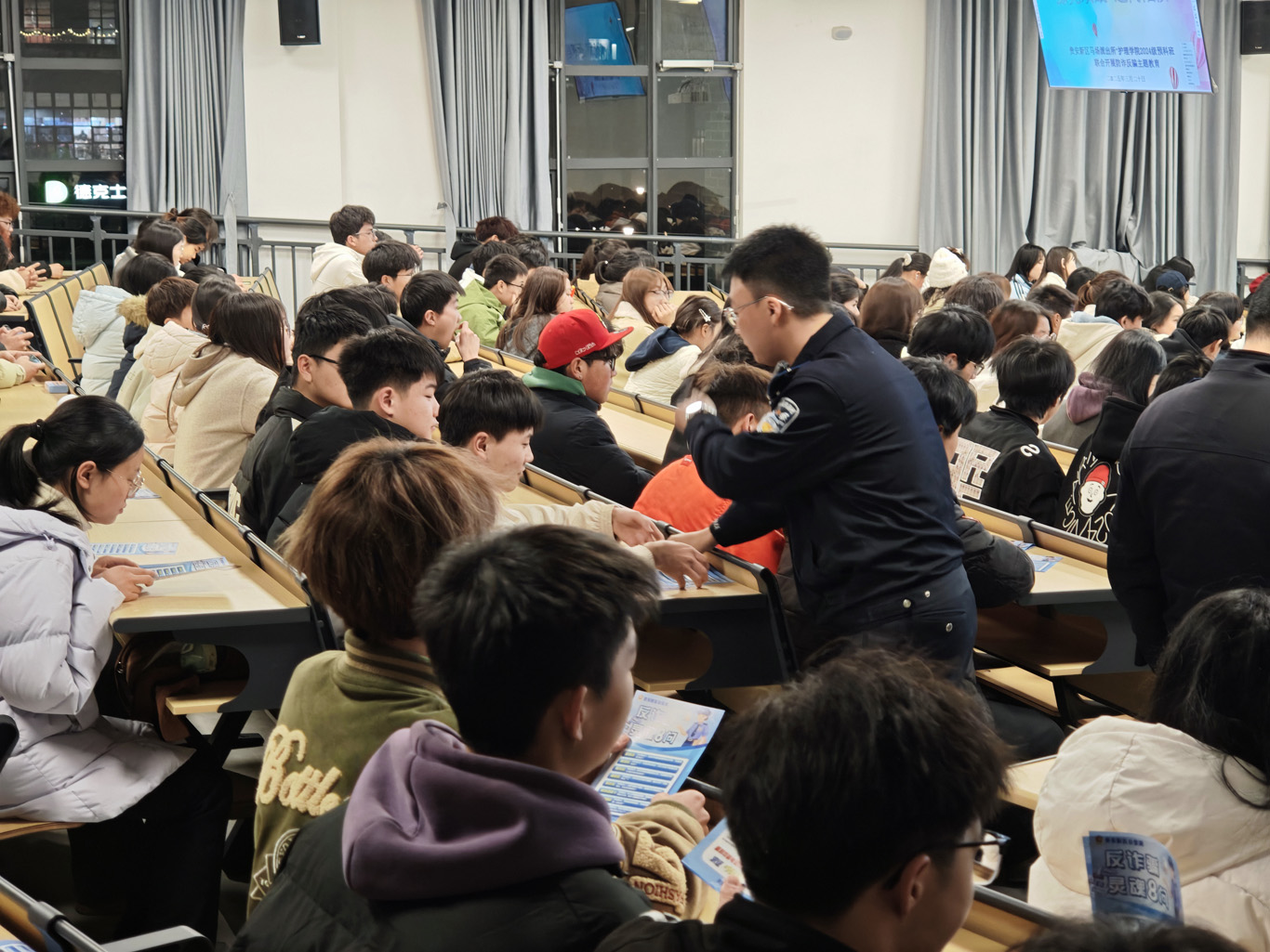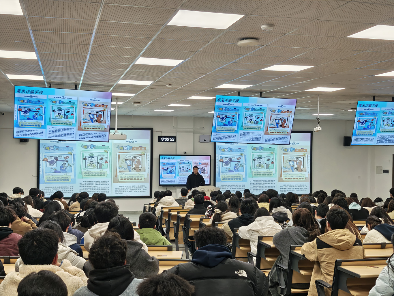 袁明结合近期校园高发的“网络刷单返利类”“冒充物流、电商、熟人类”“校园虚假兼职类”等典型案例,深入剖析诈骗分子的作案手法,通过真实案例、视频和情景模拟,直观展现诈骗过程,并告诫同学们打开国家反诈中心APP权限且定期更新、学习。