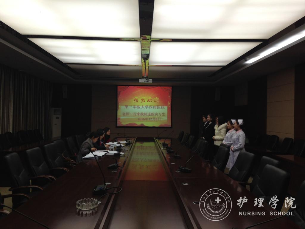 12月8日第三军医大学西南医院护理部郭上铃助理等一行四位老师来公司公司开展选拔意向性实习生工作。公司分管教学副经理刘志燕、生产实习科科长柳忠燕老师、辅导员李杏春参加了此次选拔工作,共有八十余名2014级护理本科(含助产专业、专升本)同学参加本次实习生选拔。