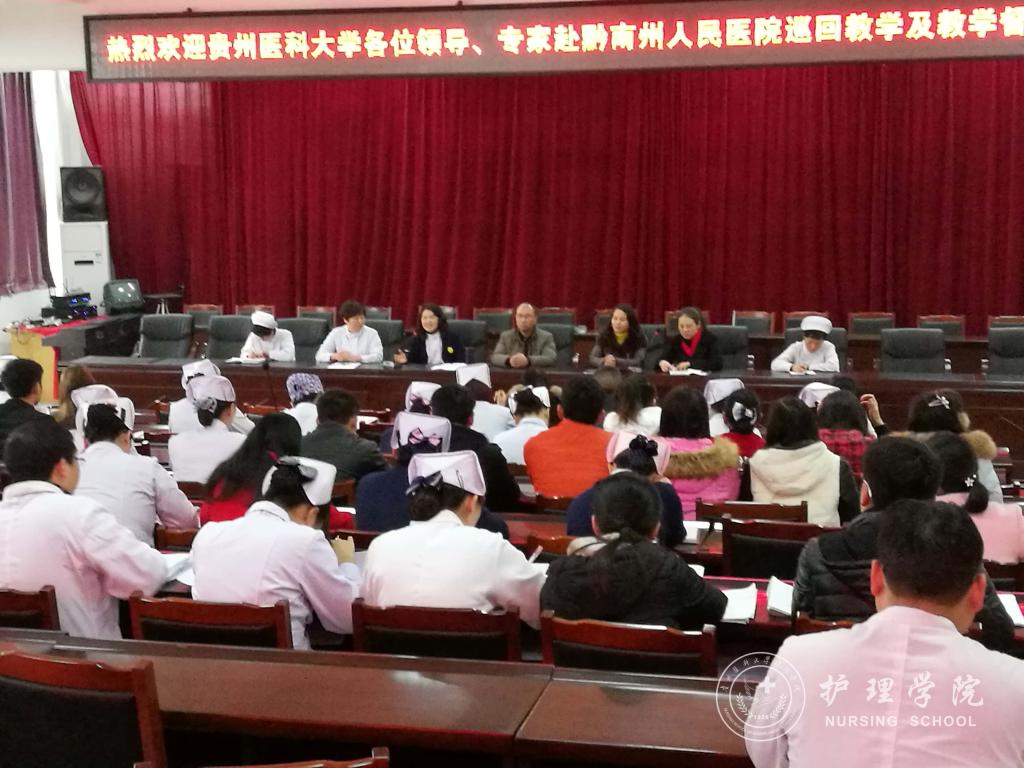 根据公司教务处教字〔2016〕71号文件《太阳成集团tyc234cc关于开展2016~2017学年护理学专业毕业实习巡回教学及教学督导检查的通知》要求,为了加强临床实习基地建设,提高毕业实习实践教学质量,2017年1月3日~9日、3月9日~17日,在教务处教学质量监控与评估办公室副主任左临轩的带领下,公司党委副书记杨英、太阳成集团tyc234cc副经理刘志燕、生产实习科科长柳忠燕、附属医院临床护理专家王锐霞、唐薇等一行前往太阳成集团tyc234cc附属医院、第二、三附属医院、附属省人民医院、贵阳市第四人民医院、黔南州人民医院、六盘水市人民医院等各实习基地进行了毕业实践教学质量检查及巡回教学。