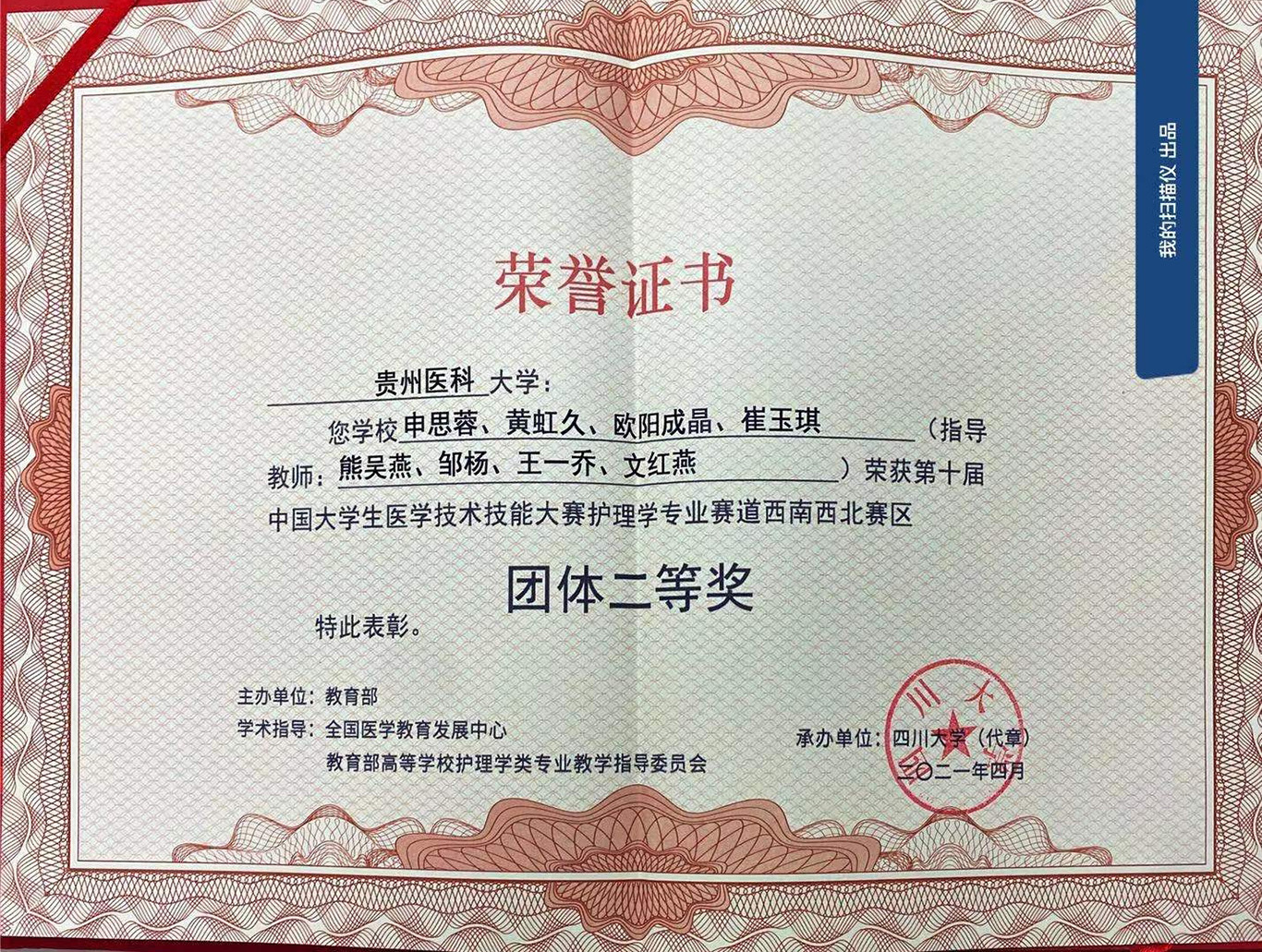 4月17-18日,由教育部主办、教育部高等公司护理学类专业教学指导委员会学术指导、四川大学承办的第十届中国老员工医学技术技能大赛护理学专业赛道西南西北分区赛中,由公司2017级护理专业员工申思蓉、黄虹久、欧阳成晶、崔玉琪组成的太阳成集团tyc234cc代表队,经过两天紧张而激烈的角逐,以扎实的基本功和出色的表现,荣获团体二等奖。