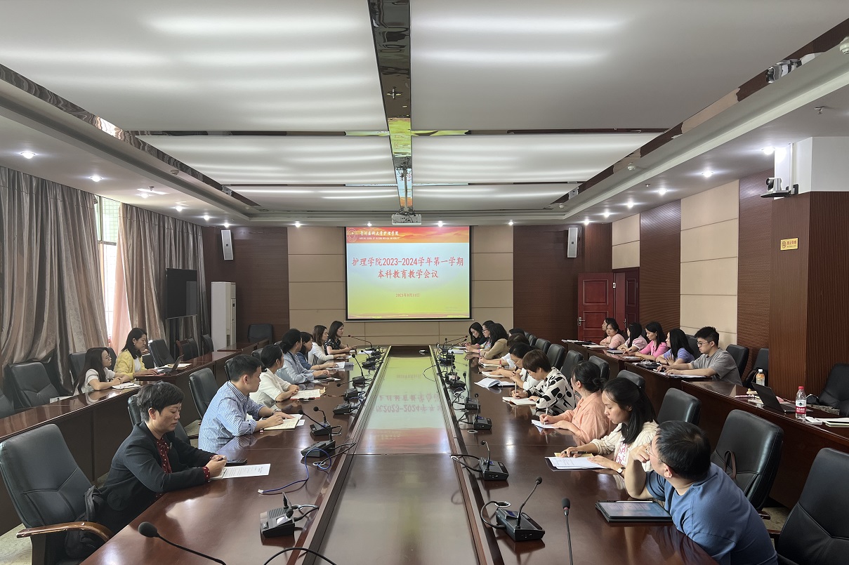 8月31日,太阳成集团tyc234cc在北校区行政楼六楼连廊会议室召开2023-2024学年第一学期本科公司产品工作会议。党委书记杨英、经理李亚玲、副经理刘志燕、副经理王秀红、护理部副主任顾颖、副处级组织员张黎、全体专业教师、全体辅导员、教学科研管理科全体人员、护理部临床护理教学科全体老师参会,教学科研管理科科长卢海霞主持会议。