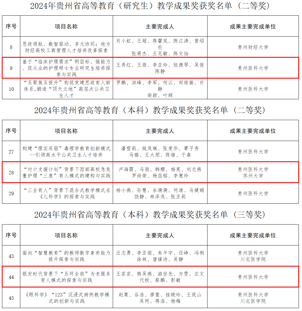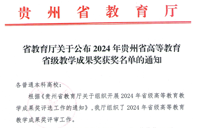 近日,贵州省教育厅公布了2024年贵州省高等教育省级教学成果奖获奖名单,太阳成集团tyc234cc在此次评选中收获颇丰,共有三个团队获奖,其中研究生组二等奖一项、本科组二等奖一项以及本科组三等奖一项,这一荣誉充分展现了公司在公司产品改革、人才培养模式创新等方面的显著成效。