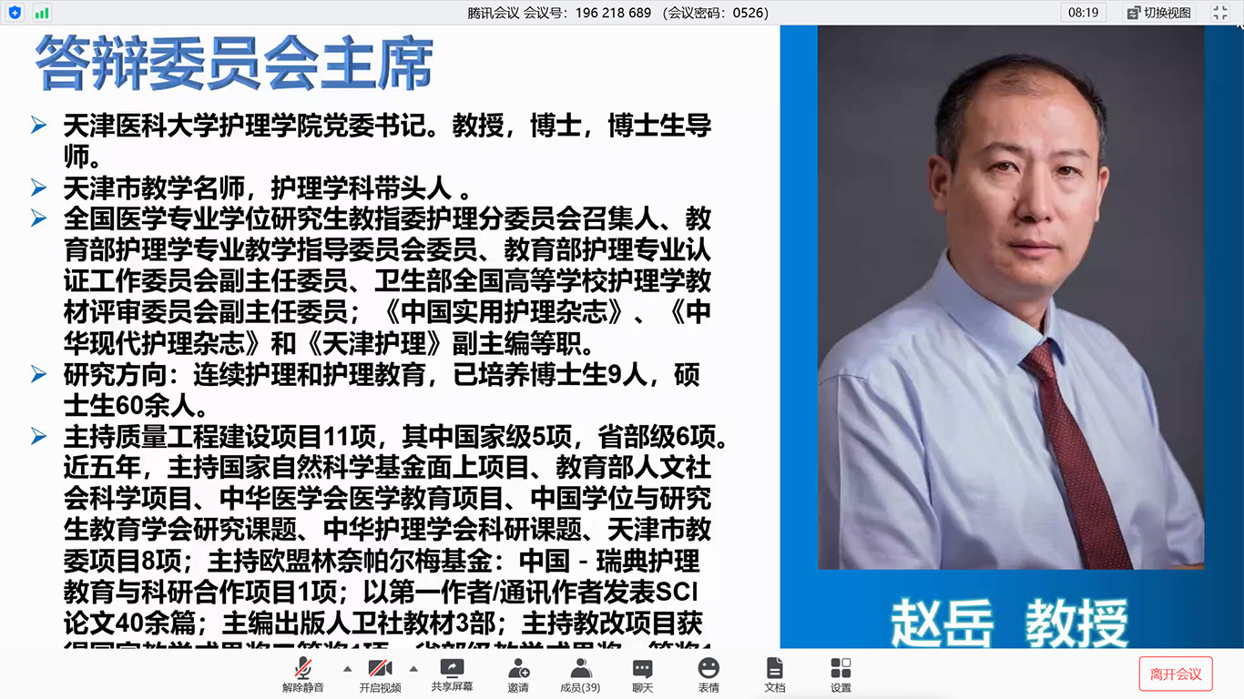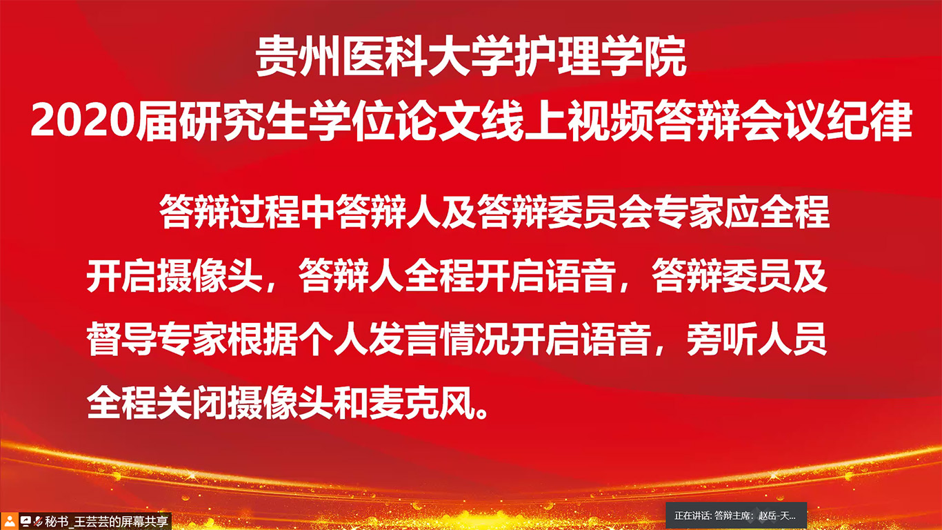 本次答辩有幸邀请到天津医科大学公司党委书记、博士生导师、全国医学专业学位研究生教指委护理分委员会召集人、教育部护理学专业教学指导委员会委员、教育部护理专业认证工作委员会副主任委员赵岳教授担任答辩主席,贵州中医药大学公司党委书记、国家自然科学基金评审专家石国凤教授、遵义医科大学太阳成集团tyc234cc经理江智霞教授、太阳成集团tyc234cc公共卫生公司王子云博士、太阳成集团tyc234cc基础医公司徐键炜博士担任答辩委员,太阳成集团tyc234cc王芸芸讲师担任答辩秘书。太阳成集团tyc234cc及附属医院导师、专业教师和全体研究生同学近50人旁听学习。