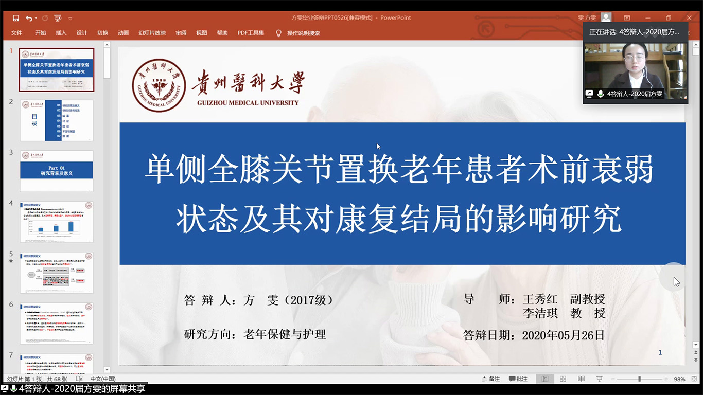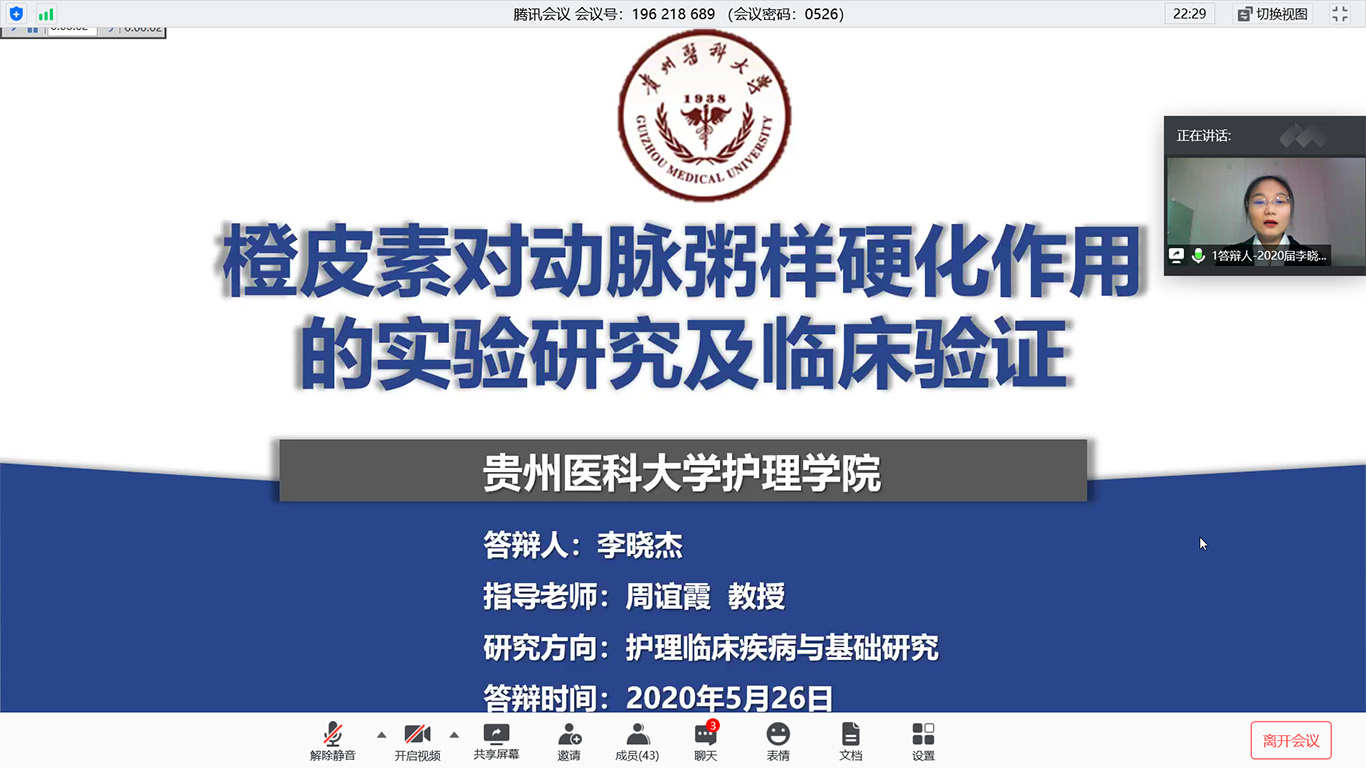 2020届共有8名硕士研究生参与论文答辩,答辩论文包括围绕护理临床疾病与基础研究方向的国家自然科学基金子课题——橙皮素对动脉粥样硬化作用的实验研究及临床验证、橙皮素调脂和抗动脉粥样硬化作用的实验及临床初步研究;研制评价工具并开展实际运用的答辩论文——ICU护士对有创机械通气撤机指征知信行问卷的研制及应用、多发伤患者ICU护理监测评估量表的研制与应用、ICU护士对医疗器械相关性压力性损伤知信行问卷的研制及应用、基于Servqual模型探讨血透中心患者对护理服务质量评价的研究;以及当前热点研究方向老年保健与护理和延续性护理相关的论文——单侧全膝关节置换老年患者术前衰弱状态及其对康复结局的影响研究、认知—行为干预在门诊颞下颌关节紊乱患者延续性护理中的应用研究。