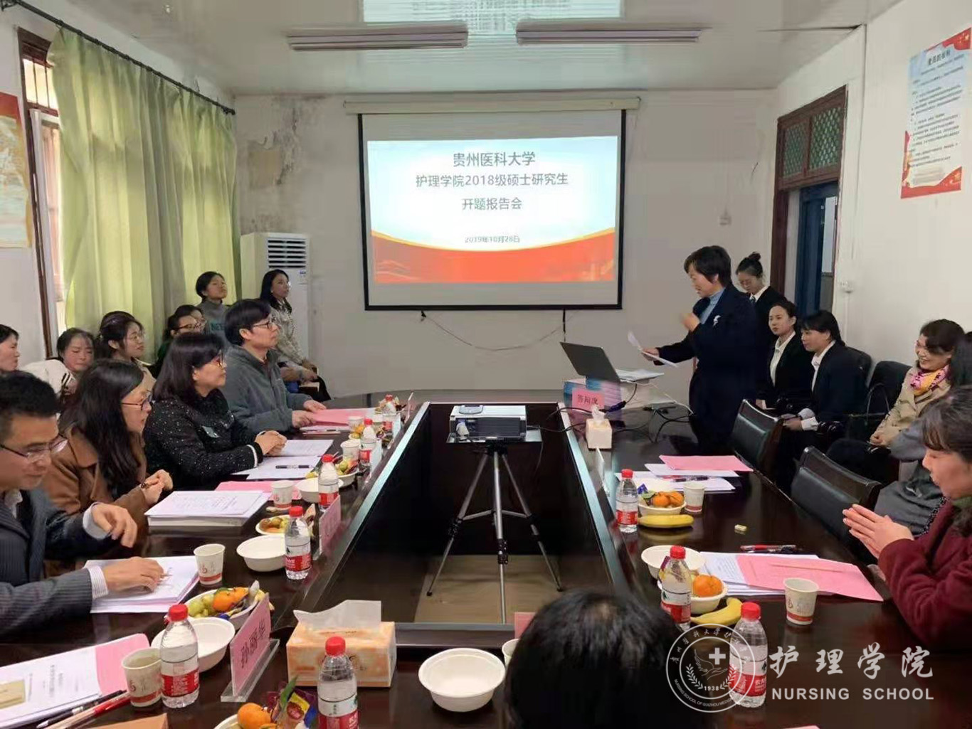 此次开题由太阳成集团tyc234cc附属医院神经外科主任、博士生导师杨华教授任专家组组长,贵州中医药大学太阳成集团tyc234cc石国凤教授、太阳成集团tyc234cc公共卫生公司汪俊华副教授、太阳成集团tyc234cc临床公司老年医学教研室莫显刚博士、附属医院疼痛科孙丽华副主任护师任专家组成员。老年保健与护理、护理临床疾病与基础研究方向王晶、裴莹莹和张丽娟3名同学参加此次开题。同学们分别就自己的课题进行了20分钟汇报,并接受了专家的询问指导。