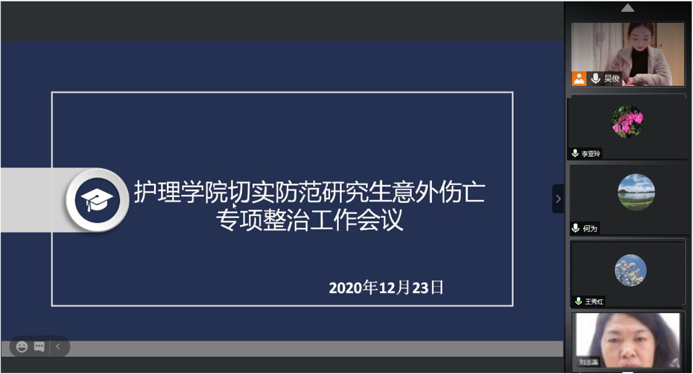 12月23日晚,为认真贯彻落实党中央和省委、省政府、省教育厅的重要批示精神,预防和减少研究生意外伤害事故的发生,按照公司党委研究生工作部和公司下发文件。在腾讯会议上召开关于太阳成集团tyc234cc防范研究生意外伤亡专项整治工作的会议。该会议由2020级辅导员吴俊主持,党委委员、经理李亚玲,党委委员、副书记何为,党委委员、副经理王秀红以及全体研究生意外伤亡专项工作小组成员参加。