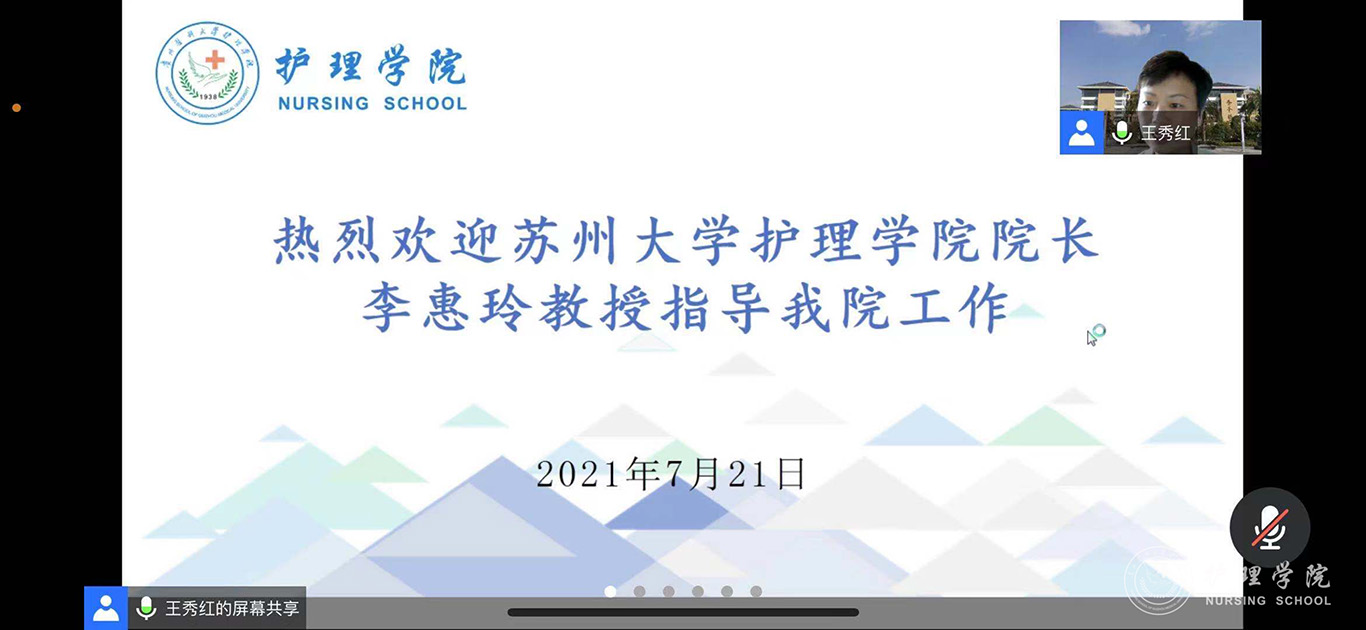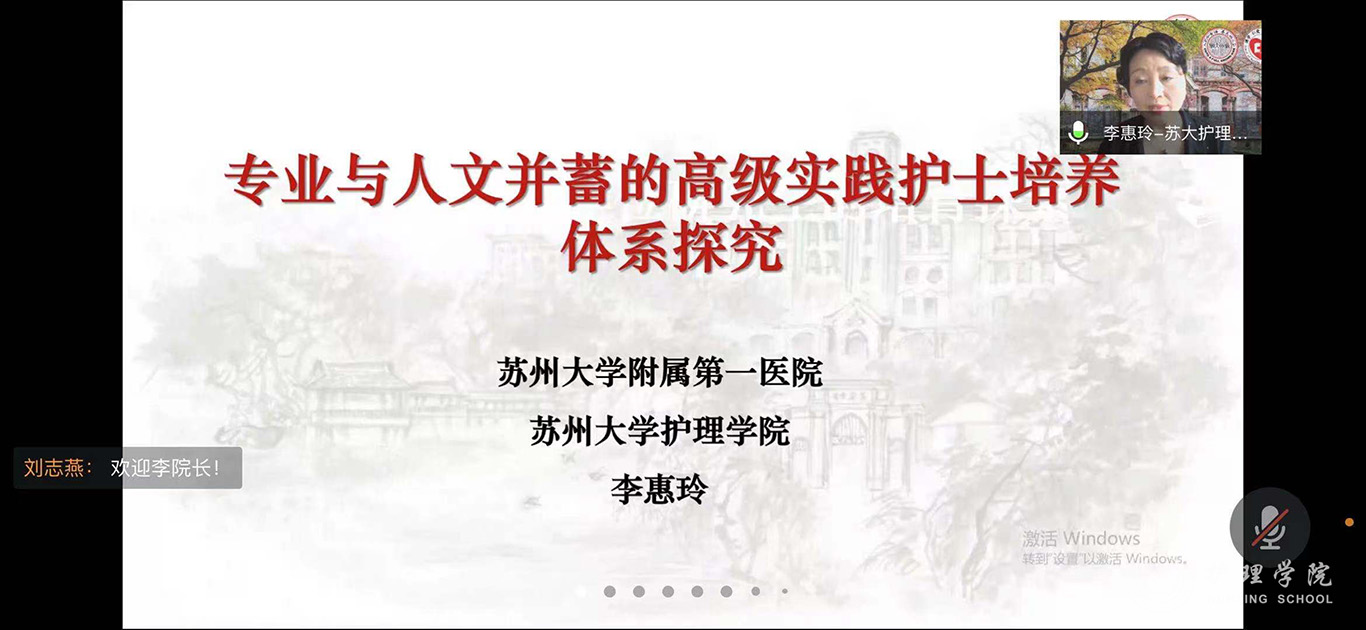 为进一步推进公司护理学科内涵建设,提升公司护理专硕公司产品质量,7月21日,太阳成集团tyc234cc特邀苏州大学附属第一医院经理助理、太阳成集团tyc234cc经理李惠玲教授为师生开展了题为《专业与人文并蓄的高级实践护士培养体系探究》的专题讲座,并进行指导。讲座和指导通过腾讯会议进行,公司党委委员、副经理刘志燕、附属医院护理部副主任蔡鹏、顾颖及研究生导师、副导师、公司和附院相关教师及研究生共计110余人参加,公司党委委员、副经理王秀红主持活动。