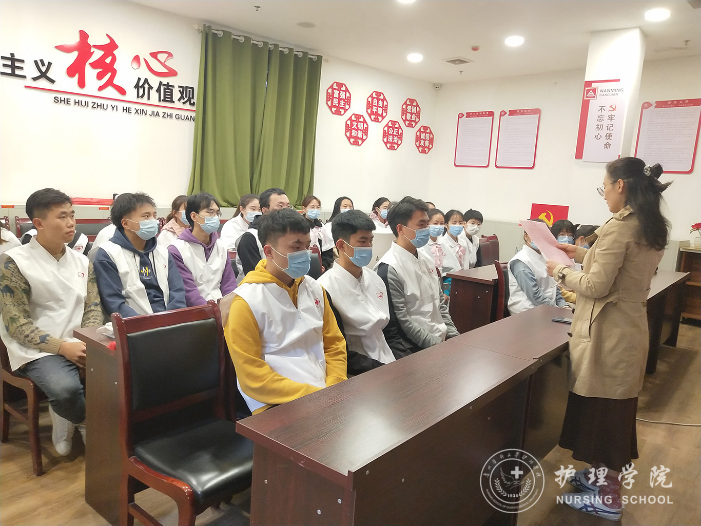 会议议程分五个部分进行。首先,由员工代表蓝阔耀发言,他说:作为一名志愿者,我们利用自己的周末时间、所学专业知识技能,在老师的指导下进行志愿服务工作,不仅使我们得到了成长,感受到肩负的责任感,也增强了我们对护理专业的自豪感,未来我们会更加努力学习,积极投身到志愿服务活动中,争取早日成长为专业的健康卫士。