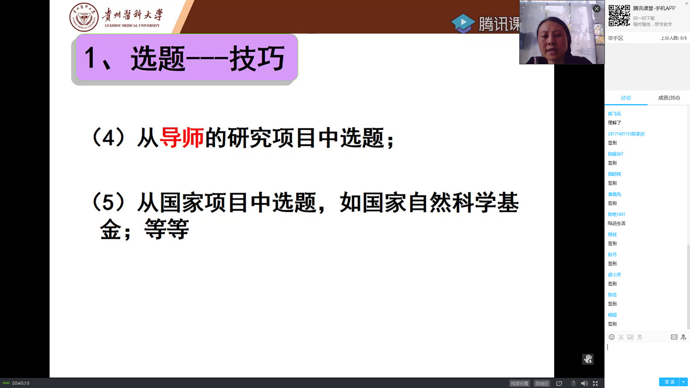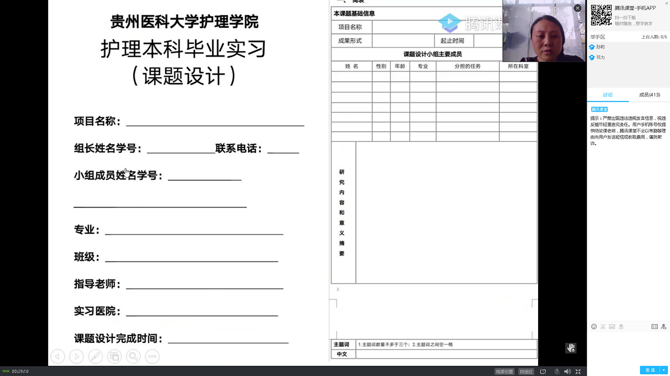 首先,由柳忠燕通过腾讯课堂平台为2017级本科同学和专升本同学主讲《课题设计》直播课和实习指导。柳忠燕就《课题设计》做详细介绍,并以选题、文献调研和科研设计三个方面着重进行讲授,以生动形象的案例来引导同学们构建科研思维,在临床工作中如何用科研思维看待问题并解决问题。柳忠燕鼓励同学们在临床实习中,要认真对待,积极发现,勇于提出科研问题。柳忠燕对同学们到各实习点医院的报到内容、注意事项进行了详细指导并对同学们的实习疑问进行了解答,希望同学们在实习中能够端正思想和心态,增强责任感,保护好自己,积极主动地完成实习。