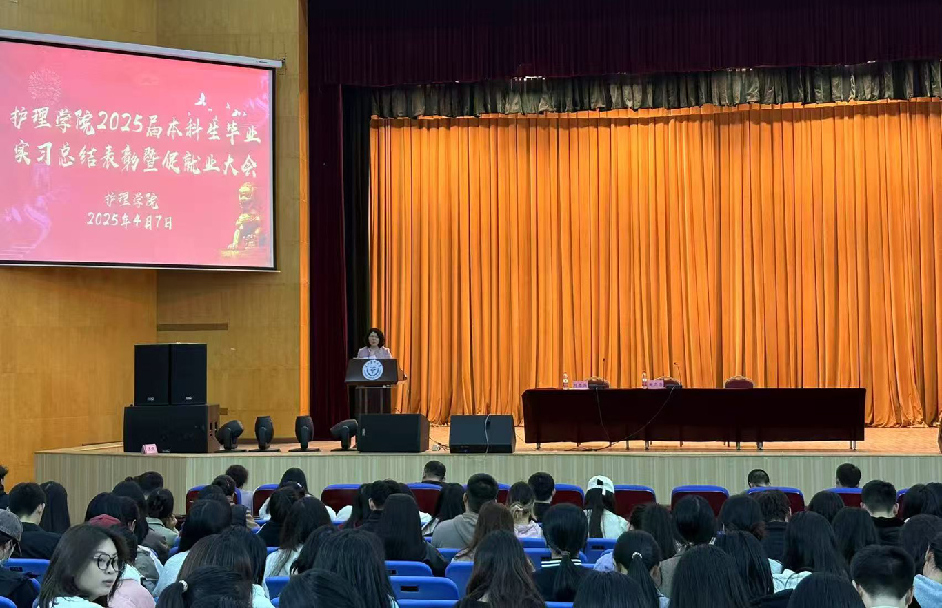 4月7日,太阳成集团tyc234cc在北京路校区礼堂召开了2025届本科生毕业实习总结表彰暨促就业大会。太阳成集团tyc234cc副经理刘志燕、生产实习科科长柳忠燕、2021级辅导员刘文壮、兰光倩老师以及2021级全体本科毕业生(专升本毕业生线上参会)参加此次会议。会议由2021级助产班杨红同学主持。