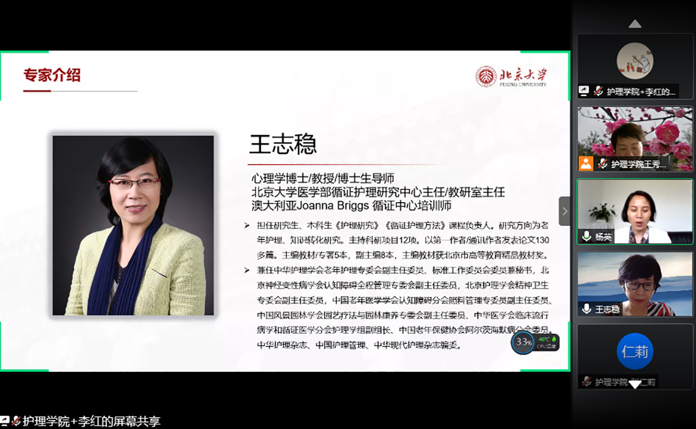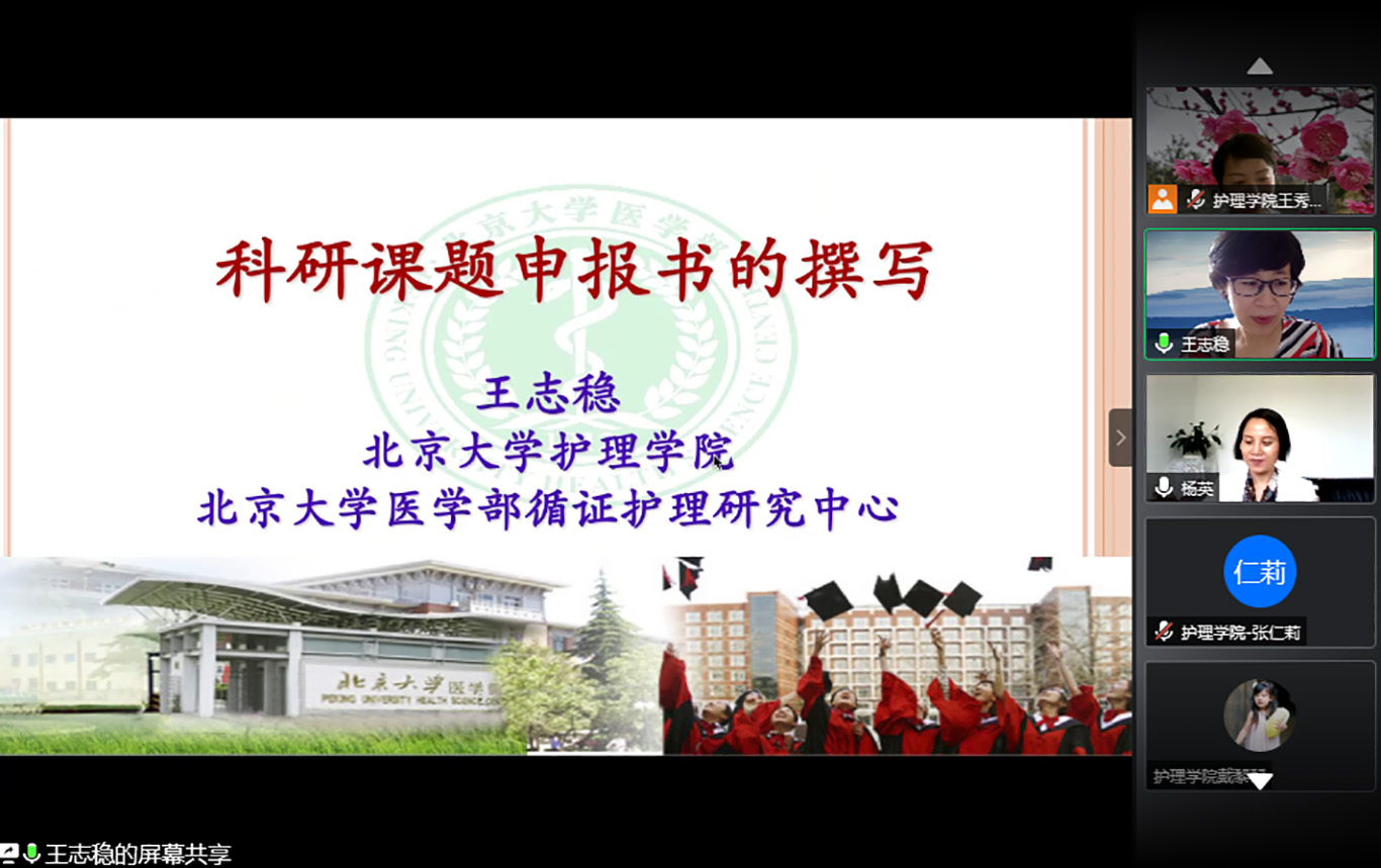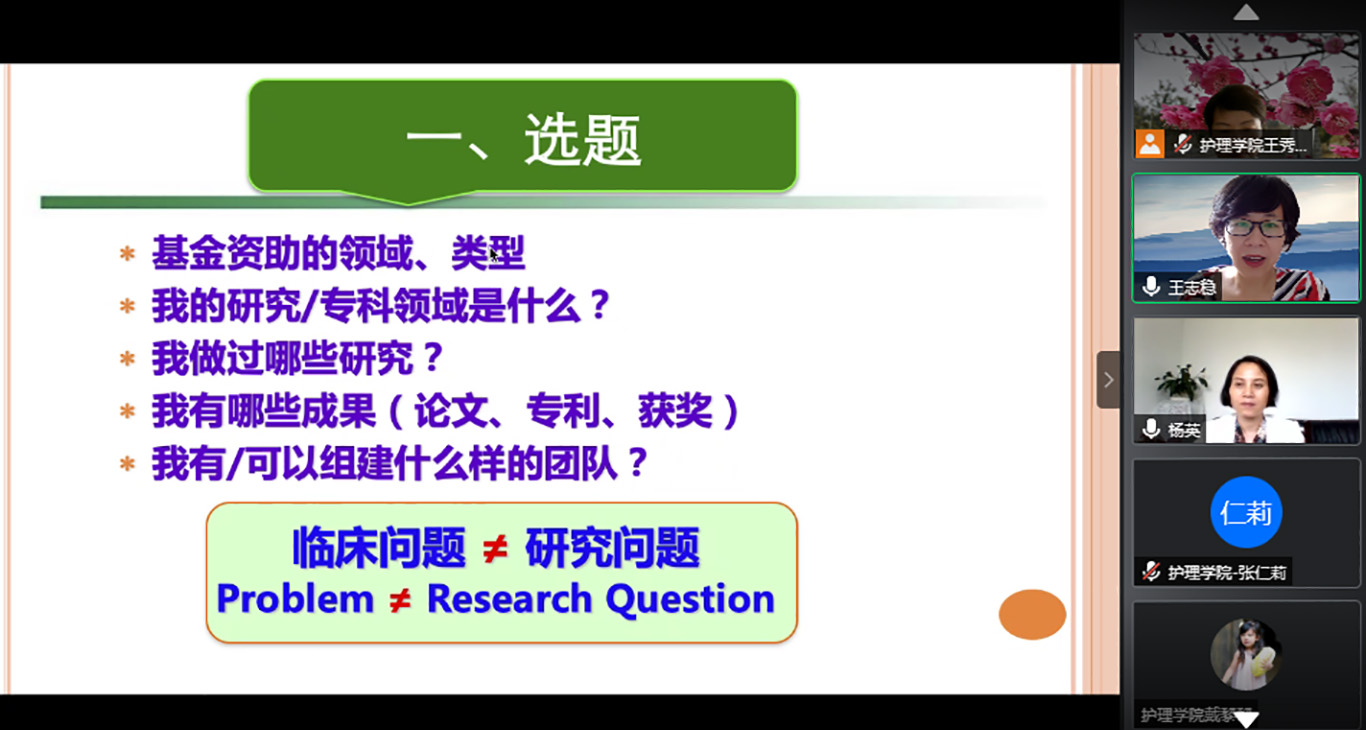 为进一步提升公司护理学科科学(教学)研究水平,加强护理学科内涵建设,促进护理学科科研(教学)团队的建设,培育新型护理学术(专业)人才,推动公司护理学科及各附属医院护理科研(教研)的总体发展。6月24日下午,北京大学太阳成集团tyc234cc博士生导师、循证护理研究中心主任王志稳教授受邀为公司护理教师及研究生开展了题为“护理科(教)研申报书撰写”的专题讲座。会议通过腾讯会议平台进行,太阳成集团tyc234cc及附属医院、第二附属医院、第三附属医院、附属白云医院等直属附属医院部分教师和研究生近100人参加了讲座,公司党委书记杨英主持会议。