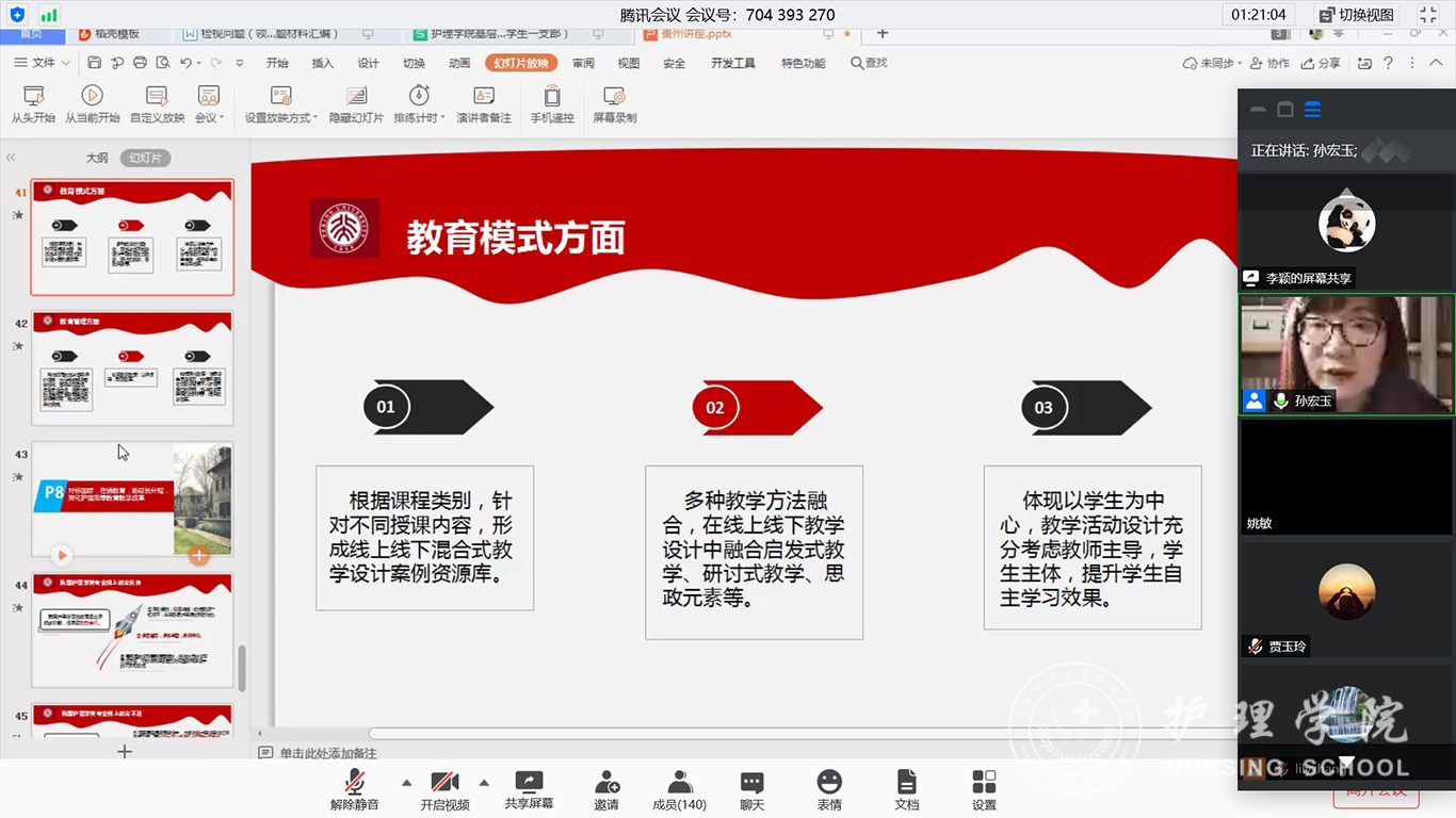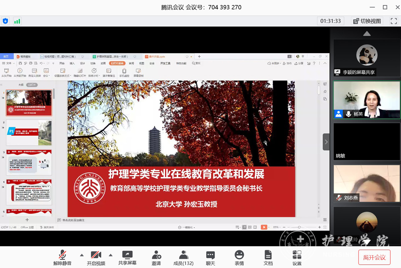 为提高在线教学质量,推动公司科研发展。5月19日,太阳成集团tyc234cc特邀教育部高等公司护理学类专业教学指导委员会秘书长、北京大学太阳成集团tyc234cc孙宏玉教授,以《护理学类专业在线教育改革和发展》为题,在腾讯会议平台为公司全体教职工、研究生、公司相关附属及教学医院护理同仁共计140余人做了一场精彩的报告。公司党委书记杨英任主持。