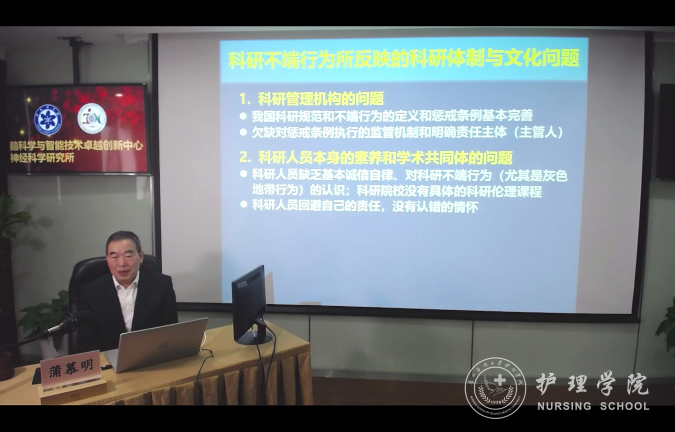 蒲慕明院士从科研伦理、科研行为、科研记录、科研不端和剽窃及论文的署名等涉及的科研诚信问题进行了详细地阐述。首先,他讲述了裁定科研不端行为的三个原则,其背后所反映的是科研体制和文化的问题。他强调不应为了个人荣耀、职位升迁和利益等目的而进行欺骗和科研剽窃。其次,他倡导青年员工树立科学诚信意识,发扬求真务实的学风,引导广大科技工作者追求真理,崇尚创新,鼓励探索。最后,他希望广大研究生同学和科研工作者要保持思考独立性,对学术交流要持一种辩证思维,与他人意见不同时,鼓励同学们踊跃发表自己不同的声音,进行思想的交流碰撞。