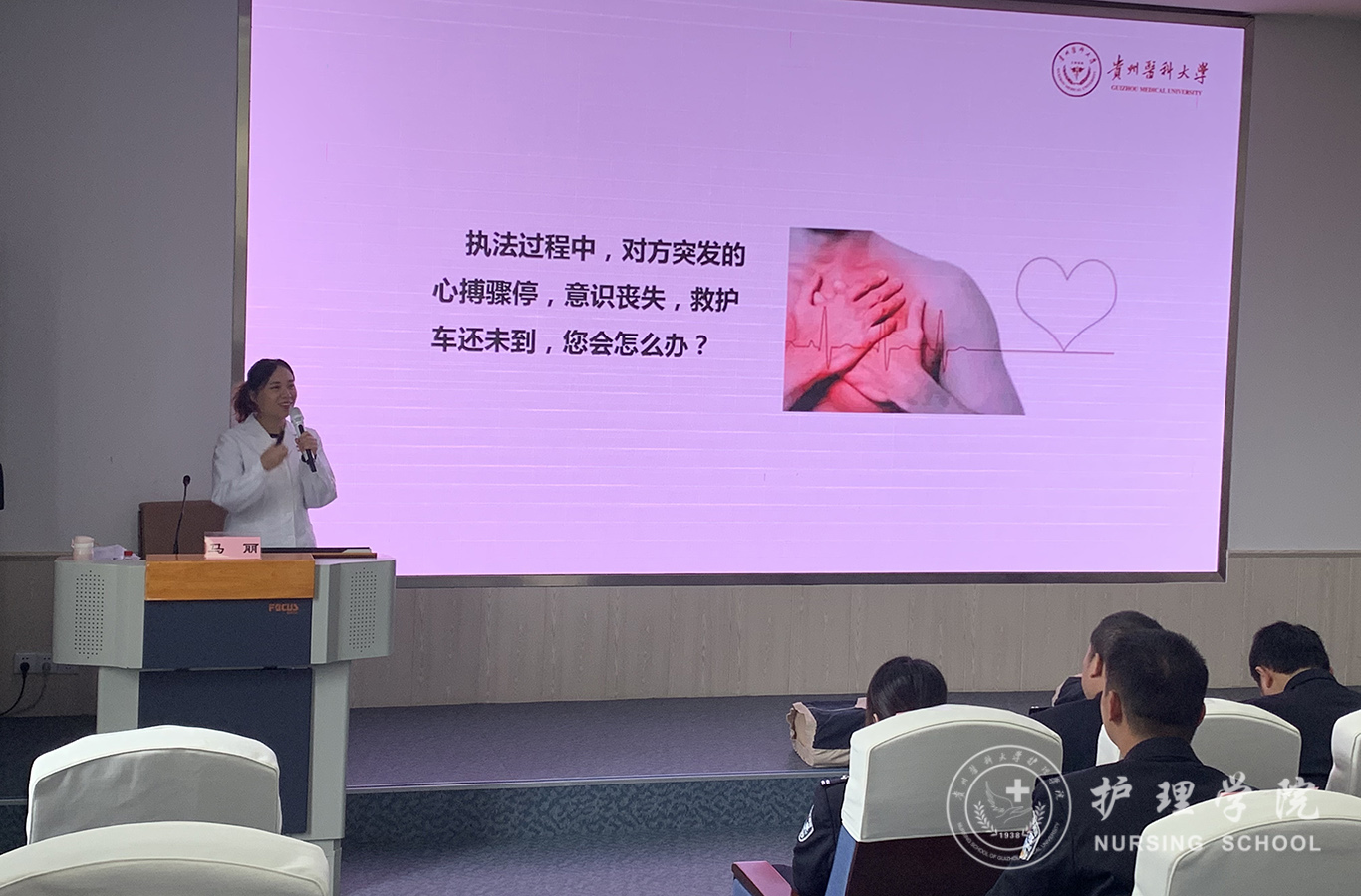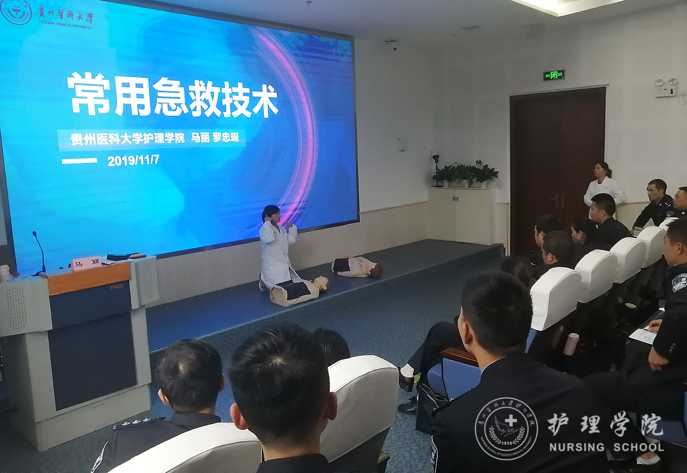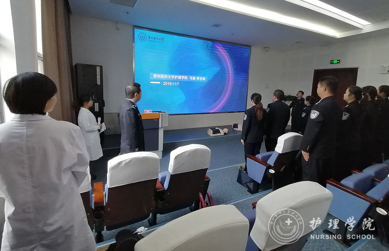 受贵州省人民检察院法警总队邀请,中国南丁格尔志愿护理服务队太阳成集团tyc234cc分队志愿者、太阳成集团tyc234cc外科护理学教研室教师马丽和罗忠琛于11月7日到观山湖区国家检察官公司贵州分院为“2019年贵州省检察机关新入警及晋升警衔司法警察培训班暨支队长硏讨班”授课,培训学员共55人,培训内容为常用急救技术。