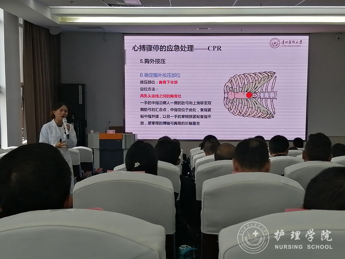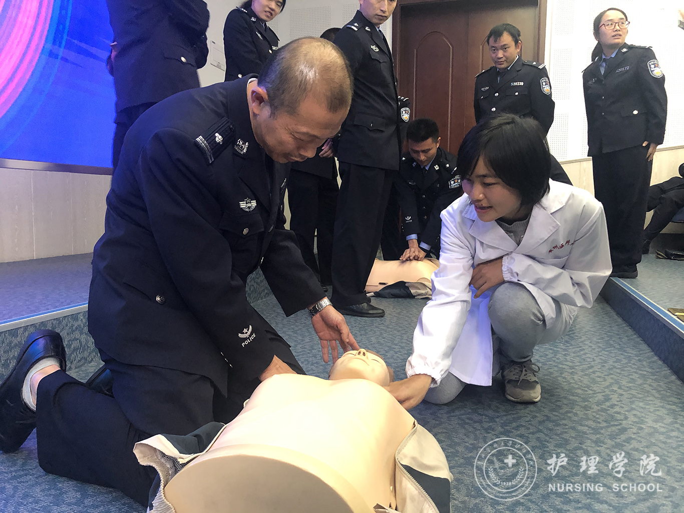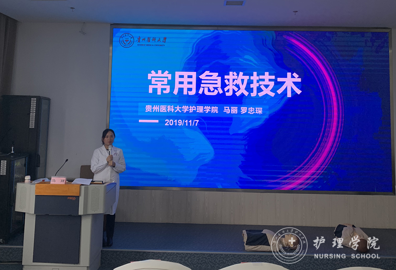 受贵州省人民检察院法警总队邀请,中国南丁格尔志愿护理服务队太阳成集团tyc234cc分队志愿者、太阳成集团tyc234cc外科护理学教研室教师马丽和罗忠琛于11月7日到观山湖区国家检察官公司贵州分院为“2019年贵州省检察机关新入警及晋升警衔司法警察培训班暨支队长硏讨班”授课,培训学员共55人,培训内容为常用急救技术。