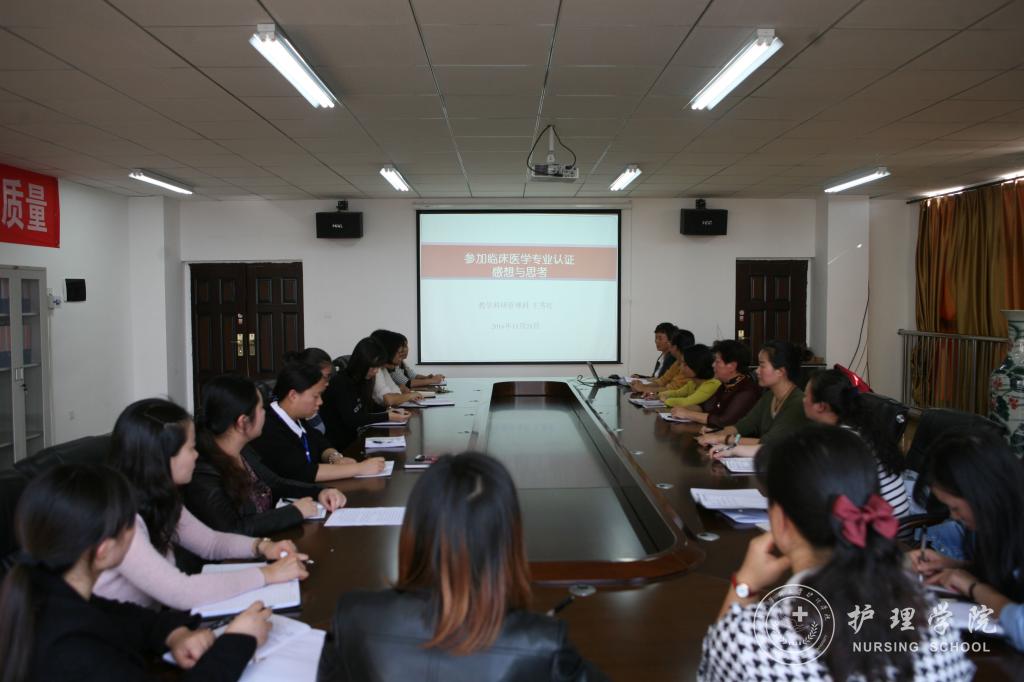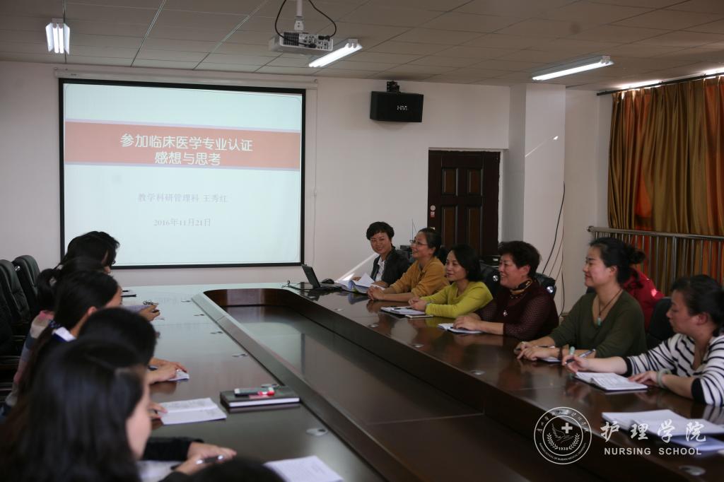 紧接着王秀红科长分享了她参加11月14日-17日公司临床医学专业认证工作的感想和思考。通过多天的跟随走访,了解到认证工作中专家的实地考察的内容和重点。观摩了校本部理论和实验教学课、附属医院的指导操作教学查房、病例讨论等教学活动。结合临床和护理专业认证标准,王秀红科长从宗旨与目标、教育计划、员工成绩评定等十个方面对跟随走访过程中的要素进行了全面分析,并结合即将进行的本科教学审核评估工作、护理专业认证工作提出太阳成集团tyc234cc的整改建议和努力方向,进一步明确和强化了教学实施过程及相关管理要求,为真正落实“以评促建、以评促改、以评促管、评建结合、重在建设”核心方针,突出内涵建设、强化内部质量保障体系建设树立牢固基础。