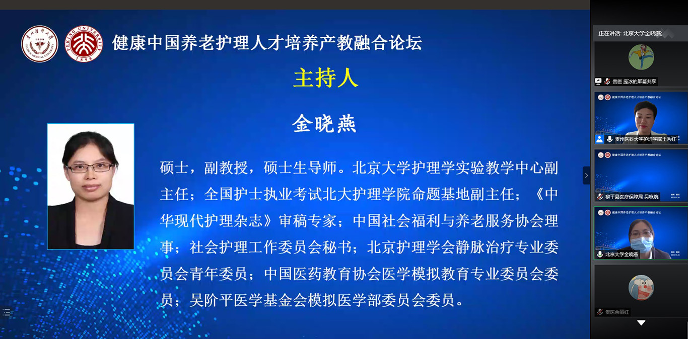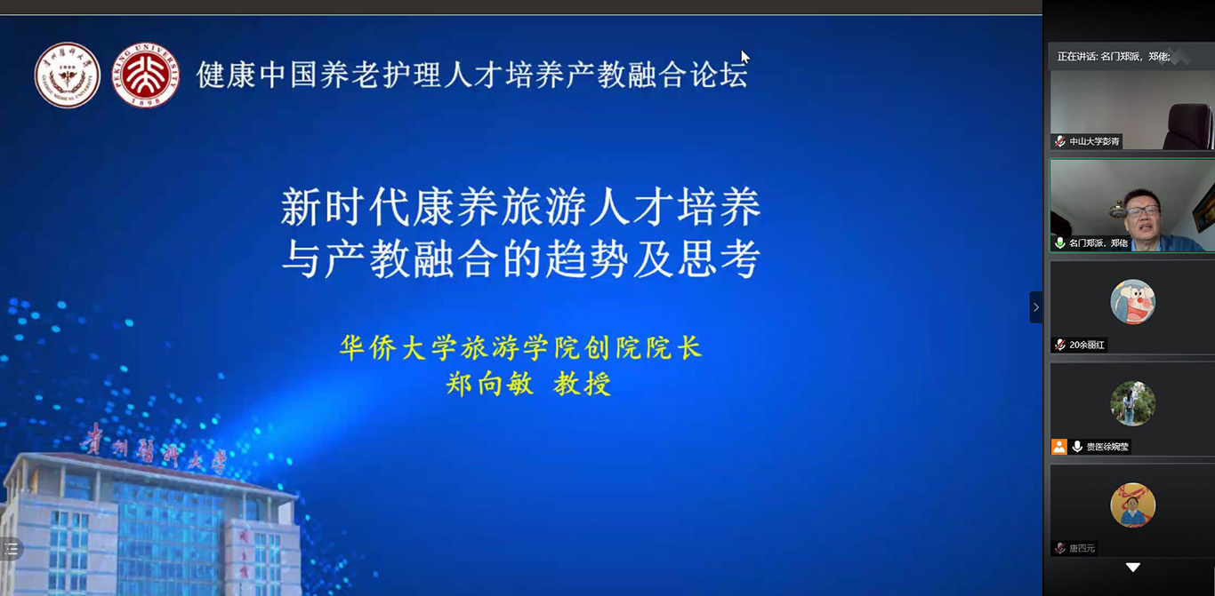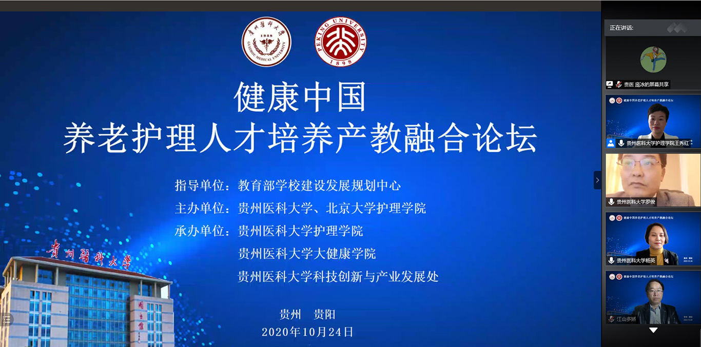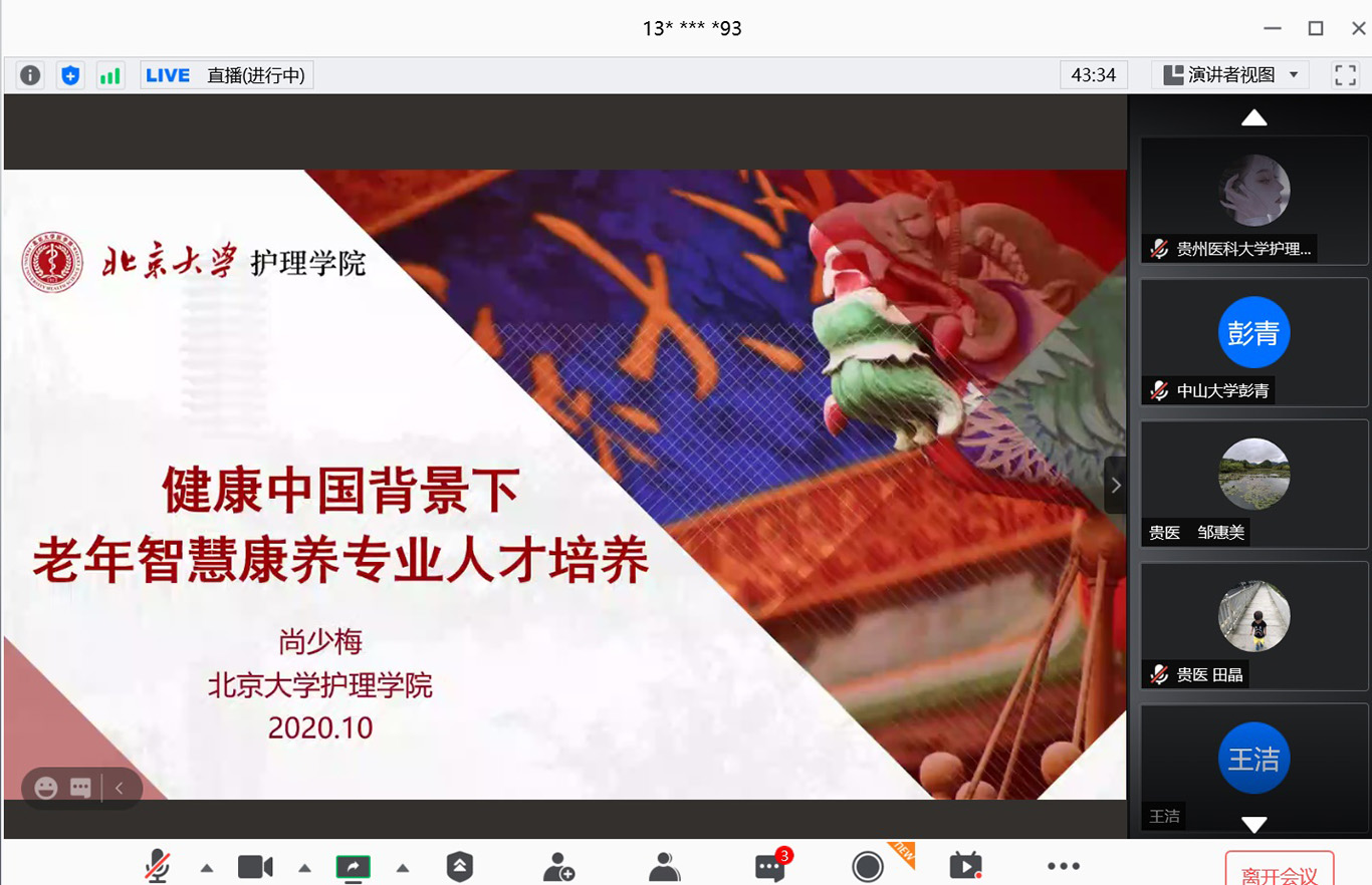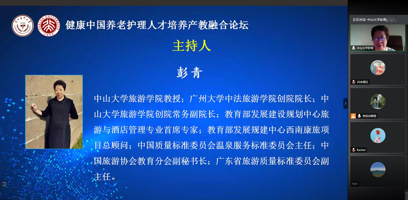中国已经进入人口老龄化快速发展阶段,老年护理需求与老年护理人才供给严重失衡,如何才能更好培养符合社会需求的老年护理人才,满足养老市场需要?10月24日,2020年老年节前一天,太阳成集团tyc234cc联合北京大学太阳成集团tyc234cc在线举办了《健康中国养老护理人才培养产教融合论坛》,全国各地近400名护理、养老、康旅等方面从业者通过会议及同步直播参会。论坛由太阳成集团tyc234cc公司党委书记杨英、中山大学旅游公司教授彭青、北京大学太阳成集团tyc234cc副教授金晓燕、太阳成集团tyc234cc副经理王秀红分别主持。