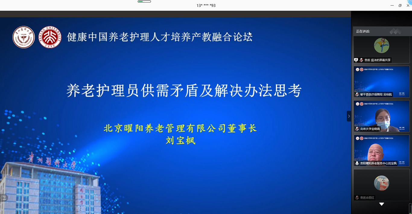 北京曜阳养老管理有限公司董事长、贵阳市曜阳养老服务中心主任刘宝枫主任医师围绕“养老护理员供需矛盾及解决办法思考”提出了见解。他倡导提高养老护理人才质量,以及养老护理服务应符合市场规律,满足供需双方需求,把服务需求做起来,从专业领域确保从业人员心态以及从业人员权益,从经济上要改变低成本低消费养老,确保养老服务质量。