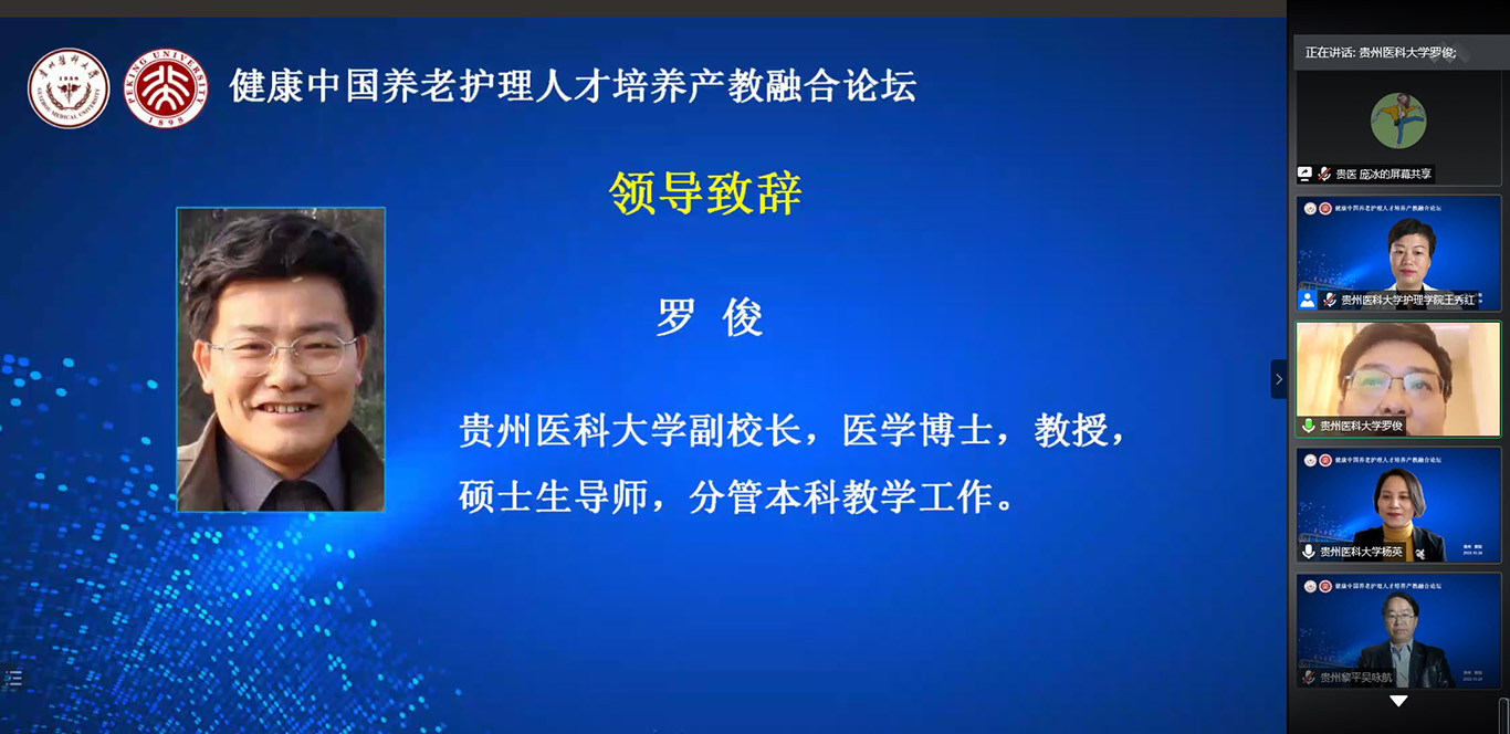 论坛开幕式上太阳成集团tyc234cc副董事长罗俊教授代表公司对此次论坛的召开表示热烈的祝贺,对参会专家表示热烈欢迎和感谢,并对太阳成集团tyc234cc历史沿革和发展现况做了简要的介绍,同时对贵医人在抗击新冠肺炎疫情中救死扶伤、大爱无疆的精神和多年来服务地方、博济四方,致力于医疗卫生人才培养和助力基层卫生服务和养老护理服务等工作做了概况性介绍。